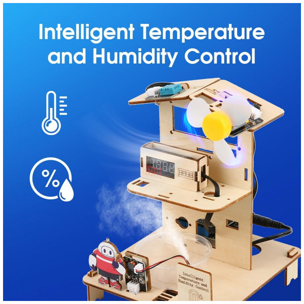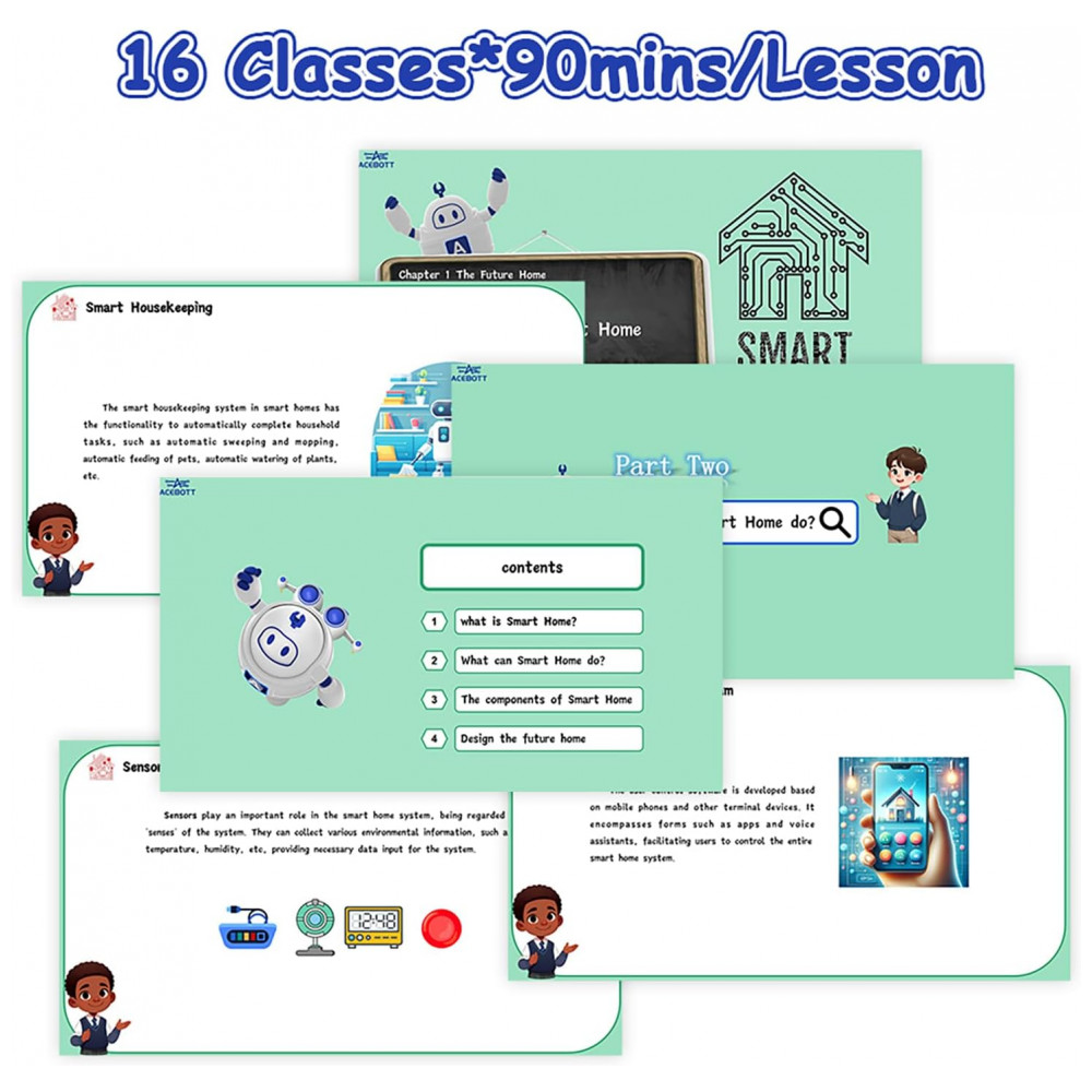 O kit ACEBOTT 3-in-1 ESP32 Smart Home and School é um conjunto educativo de automação que permite montar três projetos de casa inteligente com um controlador ESP32 compatível com Arduino, focado no ensino de programação e eletrônica para estudantes a partir de 12 anos. Os módulos podem ser configurados em cenários de iluminação inteligente, entretenimento e controle de temperatura e umidade, com montagem por estruturas recortadas em 3D, sem necessidade de solda, e instruções detalhadas passo a passo. O kit acompanha aproximadamente 90 minutos de materiais didáticos, apresentações e recursos adicionais que aprofundam os conceitos de programação para casa inteligente e princípios de hardware eletrônico.