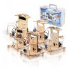 Conteúdo da caixa: Placa controladora ESP32, componentes eletrônicos, estruturas recortadas para montagem dos três cenários, cabos e acessórios de fixação