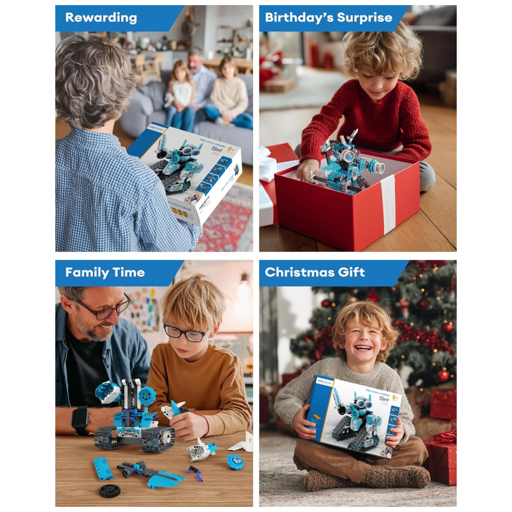 Através de controle remoto em frequência 2,4 GHz ou via aplicativo por Bluetooth, a criança pode guiar os modelos em quatro modos distintos: modo de condução, modo de percurso, controle por gravidade e modo de programação, promovendo aprendizado de lógica, coordenação motora e pensamento crítico. Ideal para quem deseja unir diversão e educação, este kit é perfeito para presentear crianças a partir de 6 anos, despertando interesse por ciência, tecnologia, engenharia e matemática de forma lúdica.