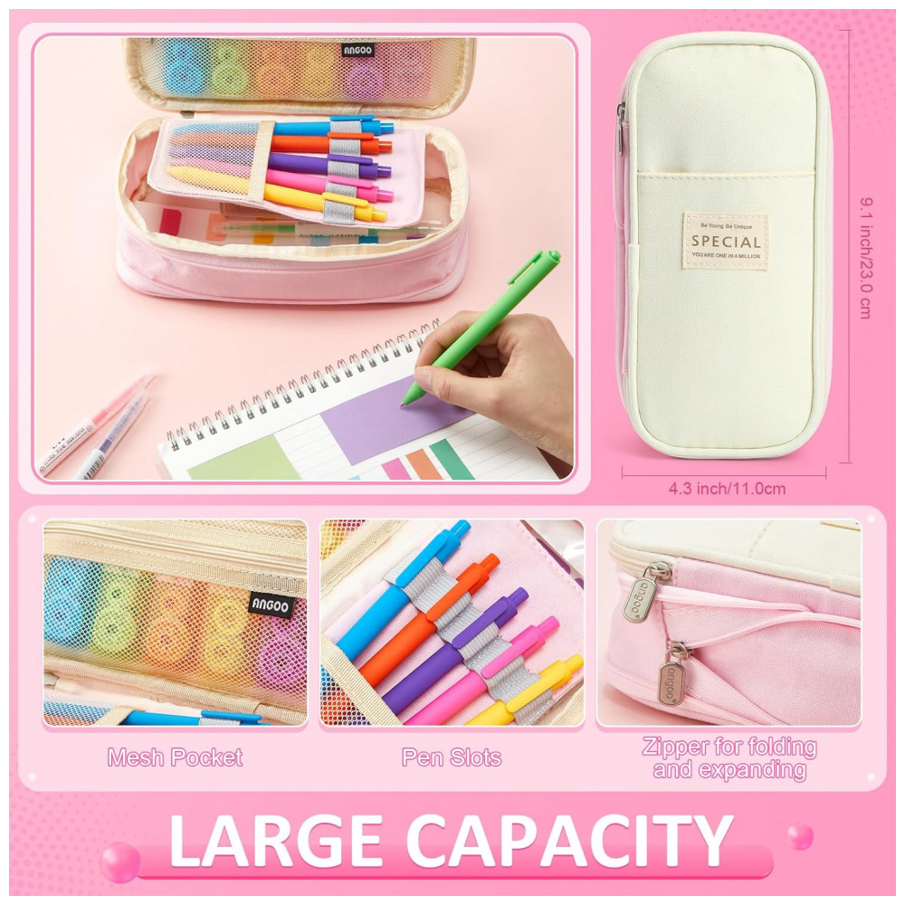 O kit escolar Janlaugh 38 peças em cores neon reúne estojo, canetas em gel, canetas retráteis, marcadores, fitas corretivas e blocos de notas adesivas em um conjunto voltado para organização de estudos, anotações e uso em ambiente escolar e universitário. O estojo em tecido poliéster possui zíper suave, bolso em tela e elásticos internos, oferecendo espaço para armazenar canetas, marcadores, refis e acessórios em um único compartimento de fácil acesso. A seleção de canetas em gel de tinta preta, canetas retráteis e marcadores de dupla ponta foi pensada para escrita contínua, marcação de trechos importantes e anotações em planners, cadernos e materiais de estudo.