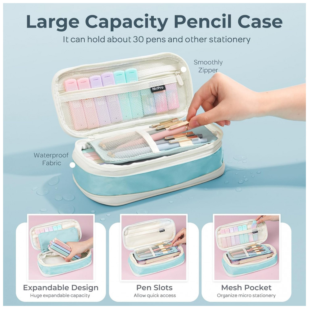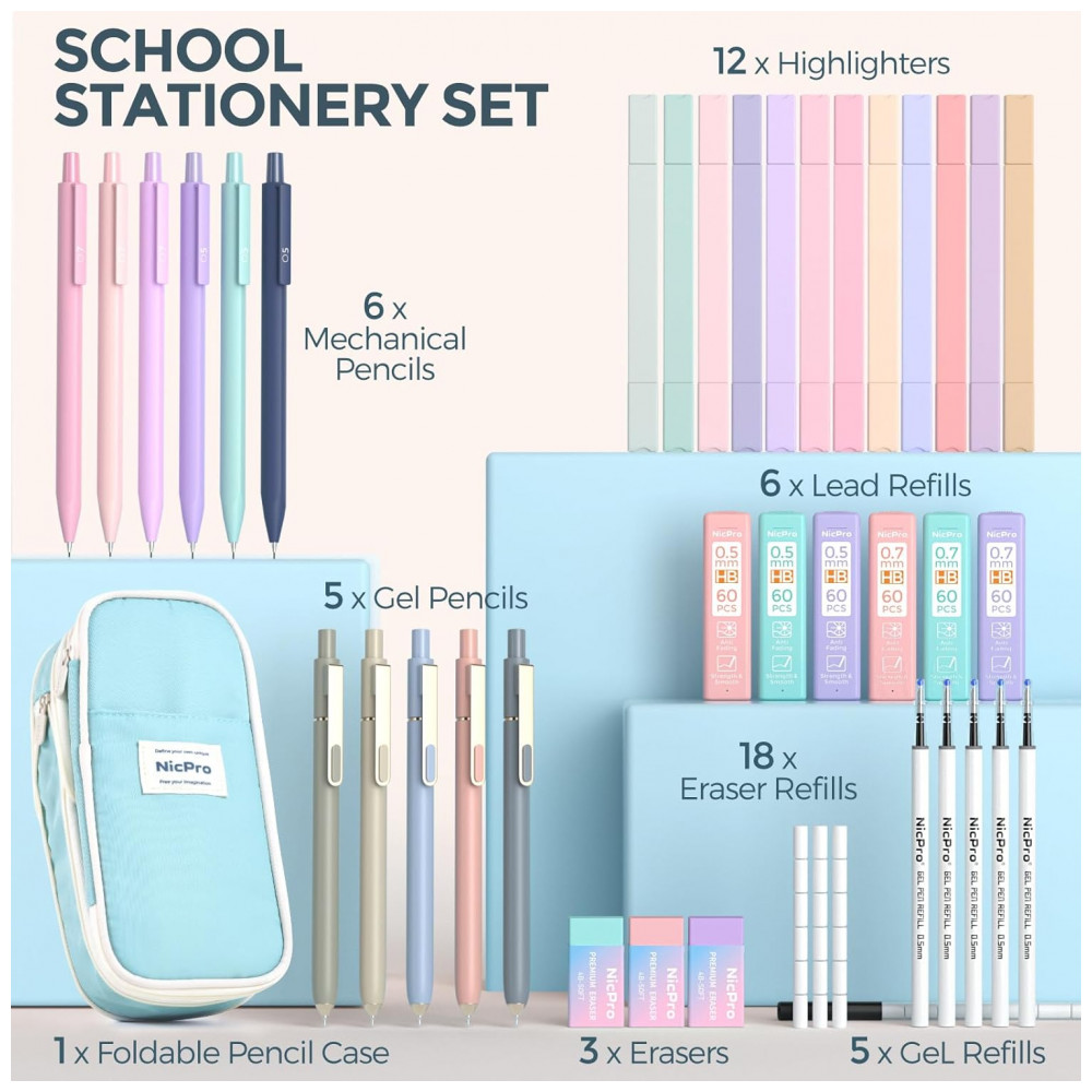 O kit escolar Nicpro 39 peças reúne em um único conjunto canetas em gel, lápis mecânicos, marcadores pastel, borrachas e grafites organizados em um estojo azul de grande capacidade. O estojo em tecido possui compartimentos e espaço interno ampliado, permitindo acomodar canetas, lápis e refis de forma organizada para uso diário em escola, faculdade ou escritório. A combinação de pontas finas e marcas-texto em tons pastel foi pensada para escrita contínua, grifos em materiais de estudo e anotações em planners e cadernos.