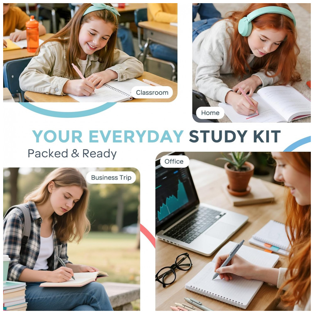 As canetas em gel pretas possuem ponta fina retrátil, tinta de secagem rápida e corpo projetado para conforto em sessões prolongadas de escrita, reduzindo manchas sobre o papel. Os lápis mecânicos em diferentes espessuras de mina atendem desde escrita comum até esboços e traços mais técnicos, acompanhados de tubos de grafite HB e borrachas com refis de topo para correções frequentes. Os marcadores pastel com ponta chanfrada permitem traços finos e largos, com tinta à base de água e cores suaves adequadas para leitura prolongada, recomendados para uso a partir de 3 anos de idade.