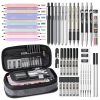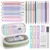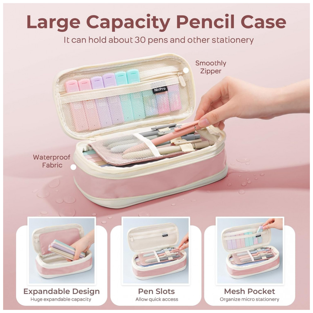 O kit escolar Nicpro 39 peças com estojo rosa reúne canetas em gel, lápis mecânicos, marcadores pastel, borrachas e grafites em um único conjunto, pensado para estudos, uso em escritório e organização de material de escrita em rotina intensa. O estojo em tecido poliéster possui zíper de deslizamento suave, compartimentos internos com bolso em tela e elásticos, além de capacidade para acomodar mais de 100 canetas, facilitando o transporte em mochilas e bolsas. As canetas em gel de tinta preta utilizam ponta fina retrátil com tecnologia de esfera, formulada para reduzir borrões e falhas, adequada para anotações prolongadas, provas e registros em planners.