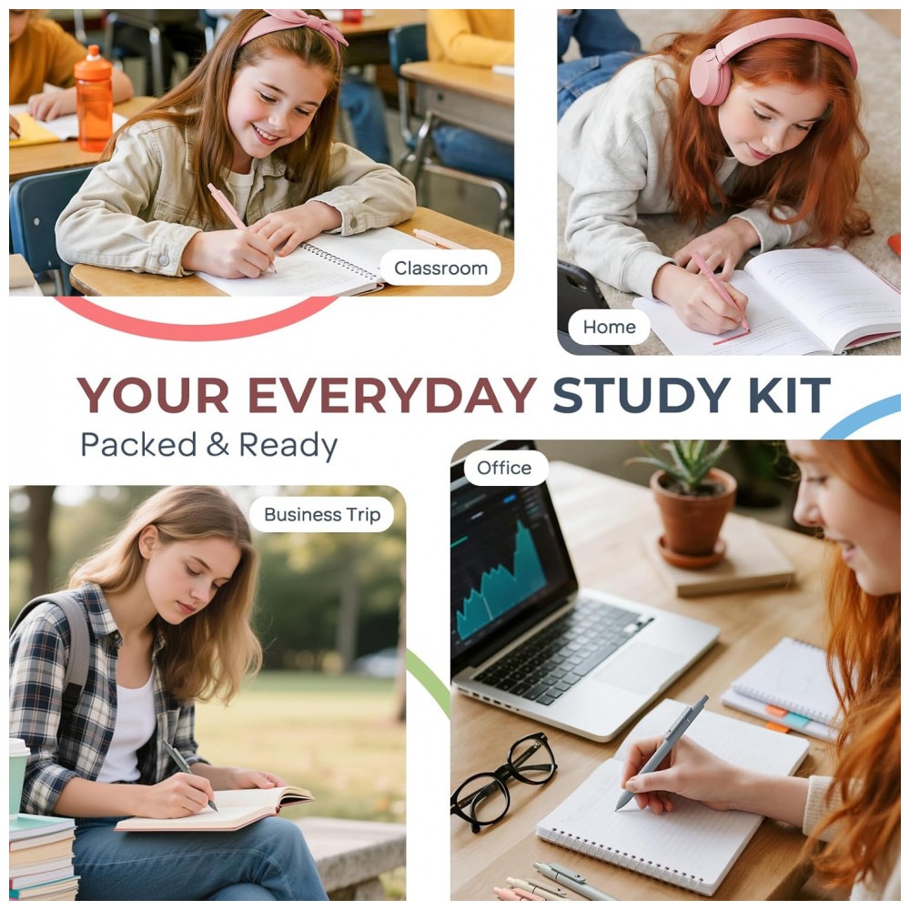 Os marcadores pastel com corpo achatado e ponta chanfrada permitem tanto sublinhados finos quanto faixas largas de destaque, usando tinta à base de água de secagem rápida e cores suaves, indicada para leitura prolongada em diários, cronogramas, materiais de estudo e cadernos. Os lápis mecânicos em 0,5 mm e 0,7 mm são acompanhados de tubos de grafite HB e múltiplos refis de borracha, com empunhadura triangular que auxilia na postura correta de escrita e redução de fadiga em uso contínuo. O conjunto é indicado para adolescentes, estudantes e usuárias que desejam manter em um único kit os principais instrumentos de escrita, marcação e correção.