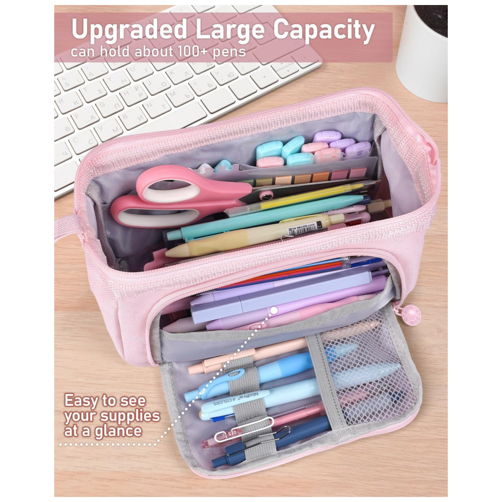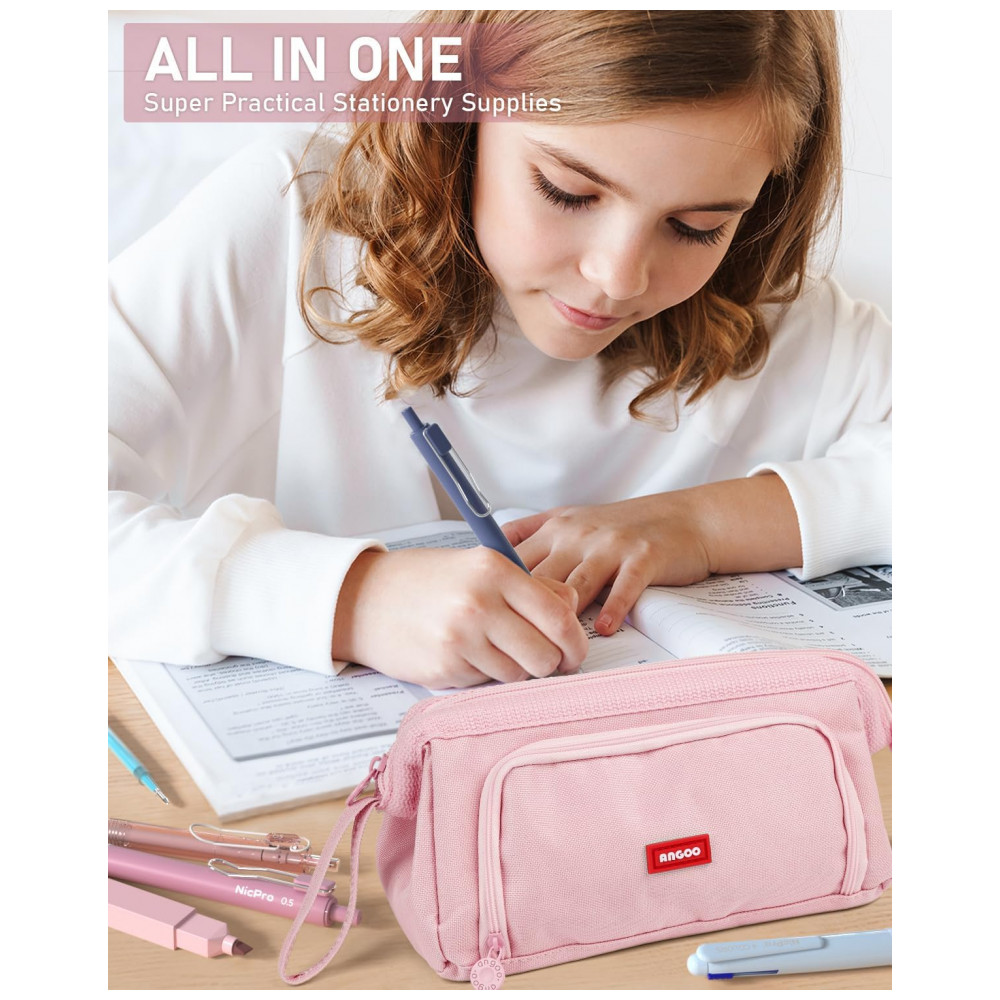 O kit escolar Nicpro 78 peças reúne marcadores pastel, canetas em gel coloridas e pretas, lapiseiras em diferentes espessuras, canetas esferográficas multicoloridas, borrachas, apontadores, grafites e um estojo rosa de grande capacidade em um único conjunto para estudos e escritório. O estojo em poliéster com zíper suave e janela frontal transparente comporta mais de 100 canetas e lápis, permitindo visualizar rapidamente o conteúdo interno e manter a organização de todos os itens. A combinação de canetas em gel, lapiseiras e canetas 4 em 1 atende escrita diária, anotações codificadas por cores, preenchimento de planners e atividades de desenho leve.