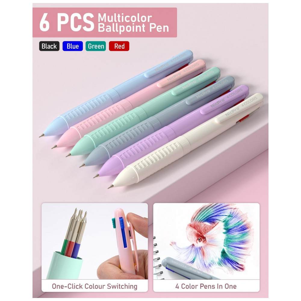 6 canetas esferográficas multicolor 4 em 1 (preto, azul, verde e vermelho em cada caneta)