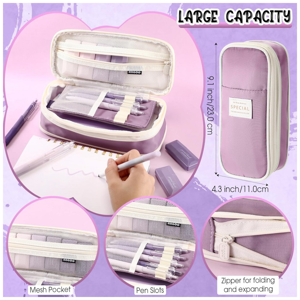O estojo é confeccionado em poliéster resistente com zíper de deslizamento suave, bolso interno em tela e elos para canetas, facilitando a organização dos itens e o transporte em mochilas e pastas. Com cerca de 22 cm de comprimento, 11 cm de altura e 5,5 cm de profundidade, oferece espaço para canetas, marcadores, refis, fitas corretivas e parte do conjunto de notas adesivas.