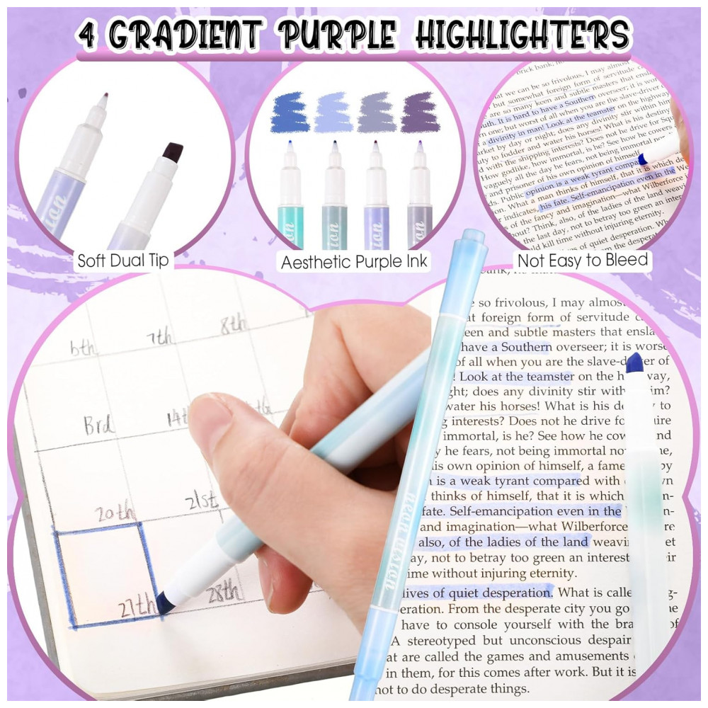 Marcadores de texto: 4 marcadores de ponta dupla em tons de roxo degradê