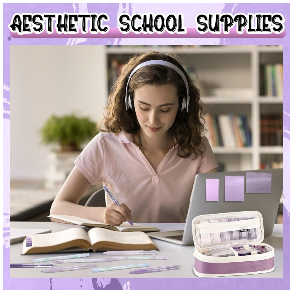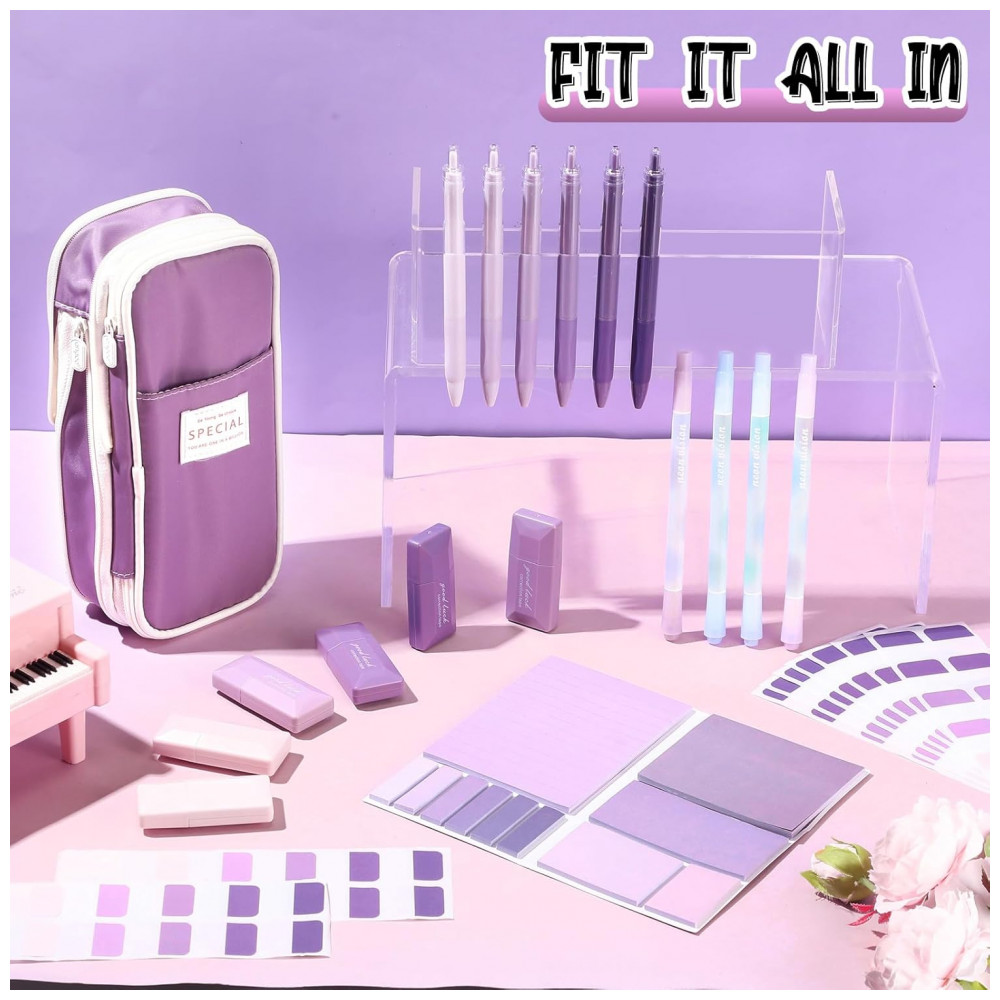 Kit escolar estético Janlaugh 38 peças com estojo canetas marcadores fitas corretivas notas adesivas e marcadores de página roxo degradê clássico