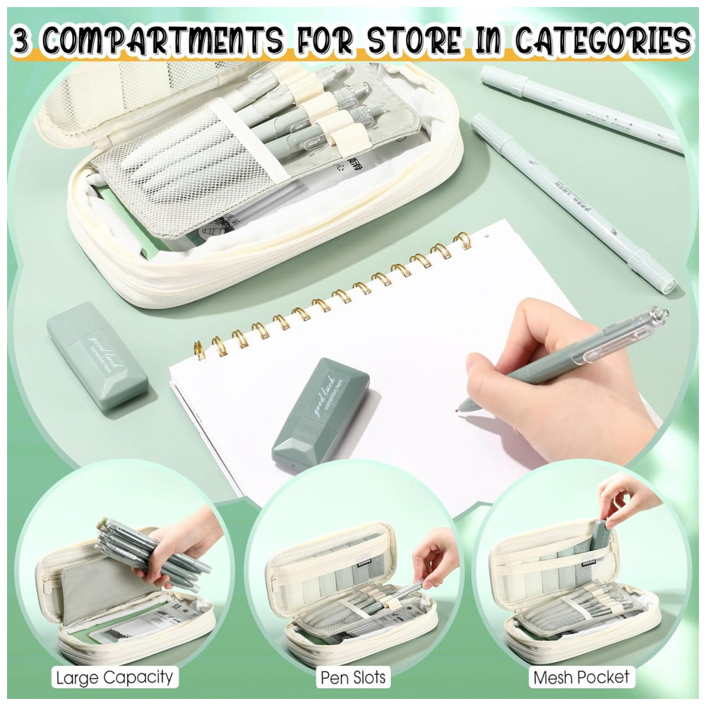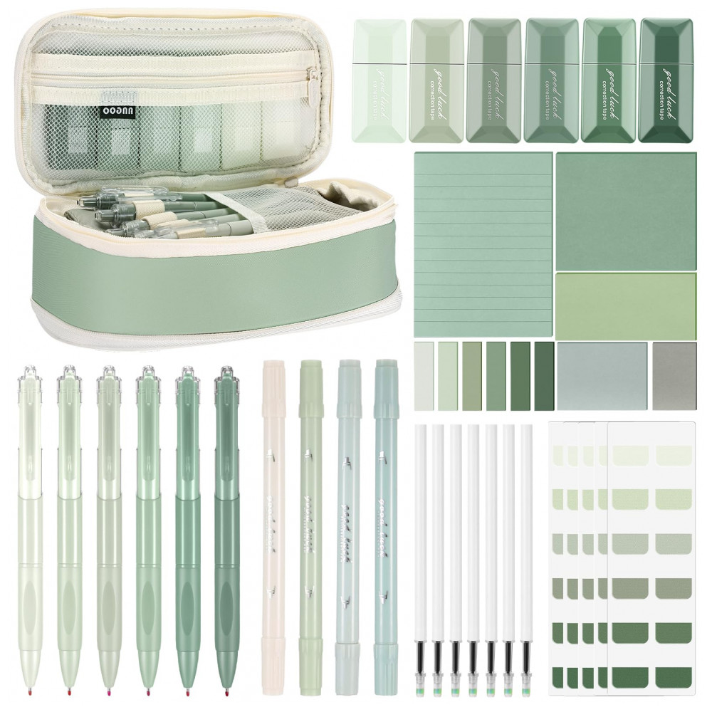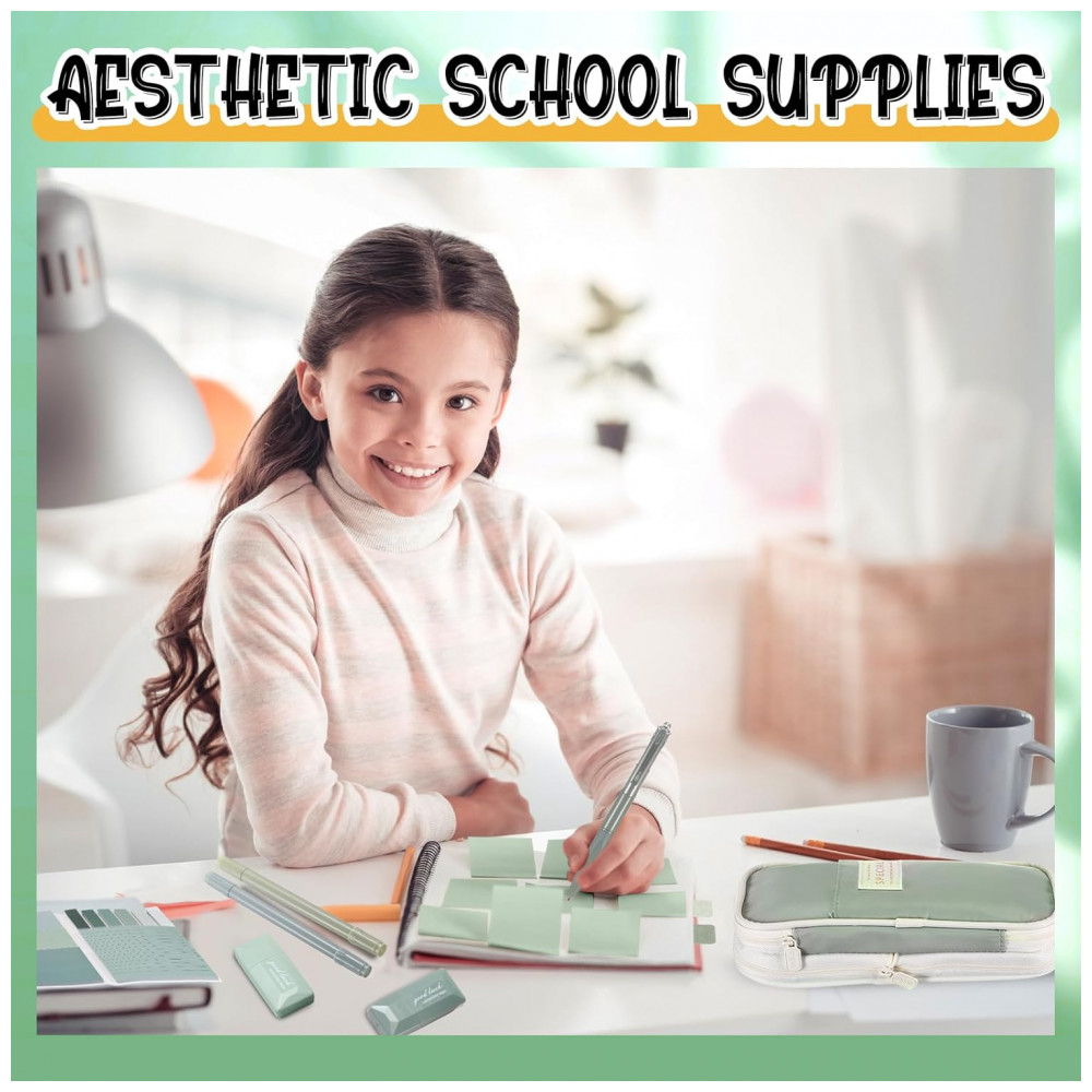 Kit escolar estético Janlaugh 38 peças com estojo canetas marcadores fitas corretivas notas adesivas e marcadores de página verde sage clássico
