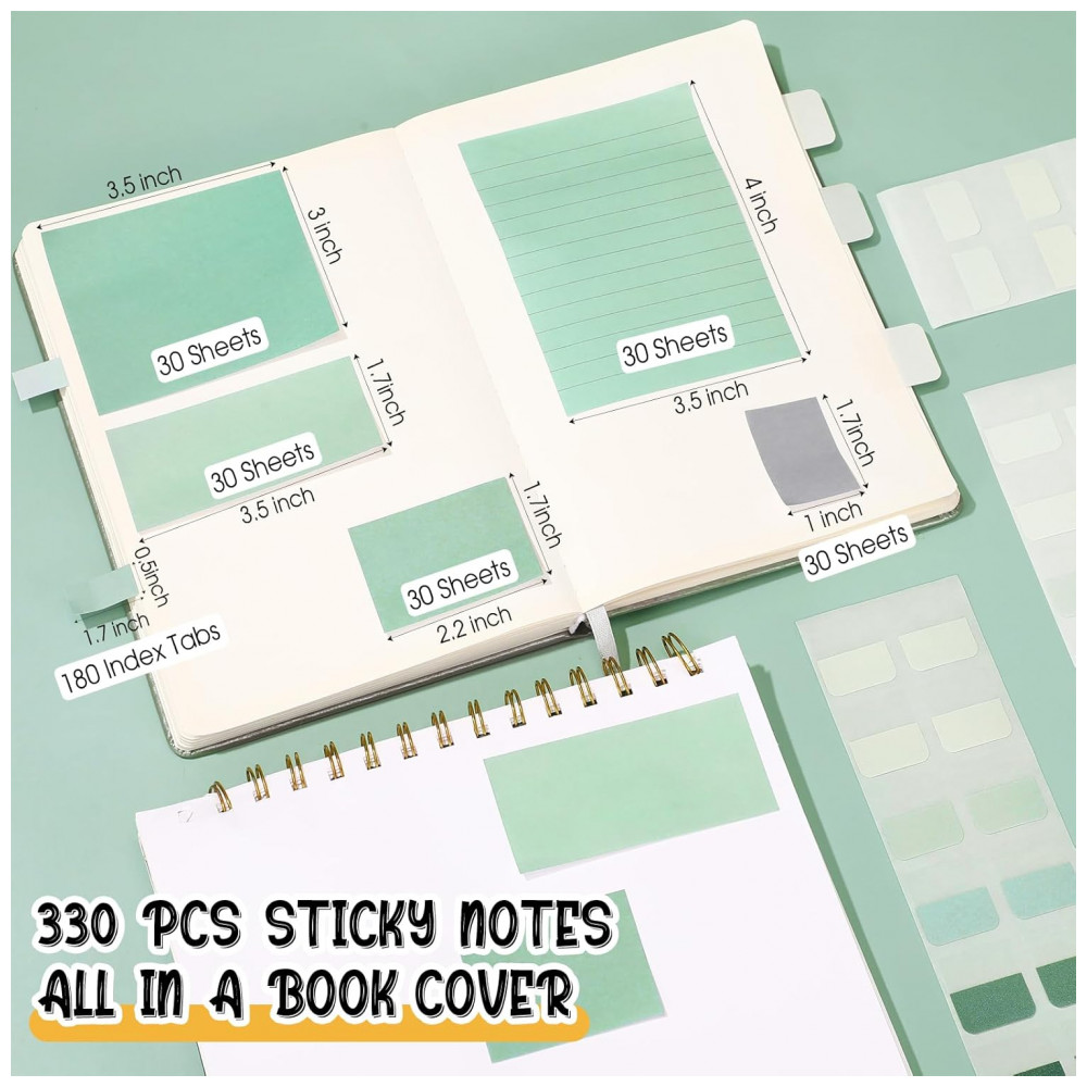O conjunto de notas adesivas soma cerca de 330 unidades em diferentes tamanhos e formatos, permitindo uso como lembretes, marcações de página e organização de conteúdo em cadernos, planners e documentos. Os 120 marcadores de índice, distribuídos em 10 páginas, auxiliam na criação de divisórias e na marcação de seções em livros, cadernos e relatórios.