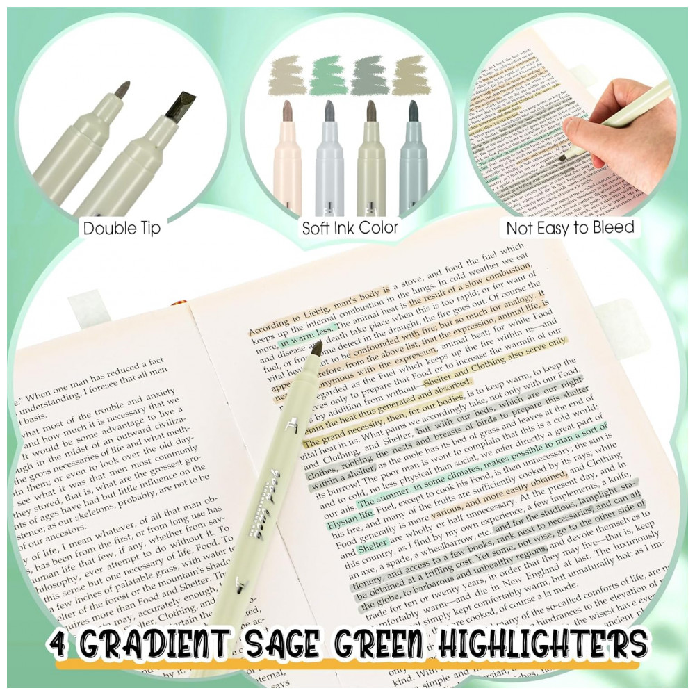 Marcadores de texto: 4 marcadores de ponta dupla em tons verde sage