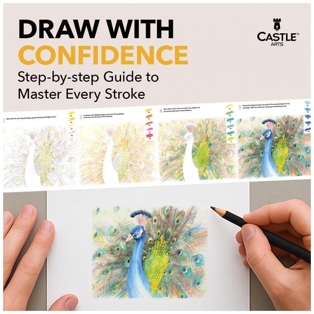 GUIA PARA DESENVOLVER SUAS HABILIDADES Livro de 28 páginas detalhado e fácil de seguir repleto de dicas e demonstrações para aproveitar ao máximo os materiais de arte além de tutorial desdobrável para recriar a impressionante ilustração da tampa MAIS testador e folhas protetoras