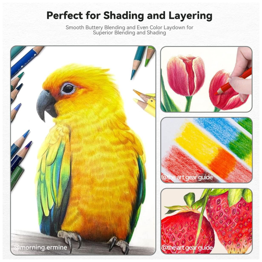 Camadas e mistura no papel facilmente Aqueles lápis de cor com um núcleo durável e mais macio e textura amanteigada que os torna ideais para misturar, estratificar e sombrear. As cores serão aplicadas suavemente na superfície de desenho e proporcionarão uma ótima cobertura com menos esforço.