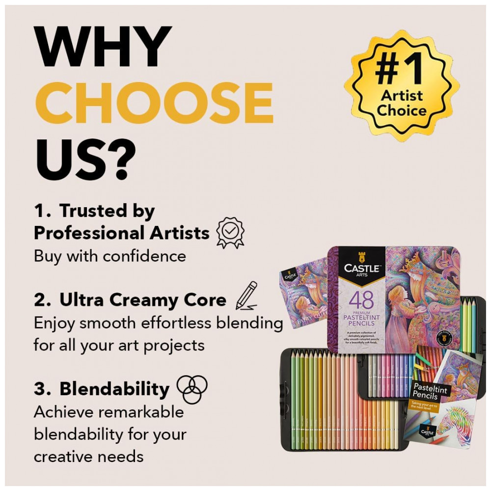 ABRIR POTENCIAL Nossa linha única e de 48 lápis pastel, nomeados e numerados para uma escolha precisa de escolha entre as três bandejas em camadas da caixa de lata de apresentação digna de presente.