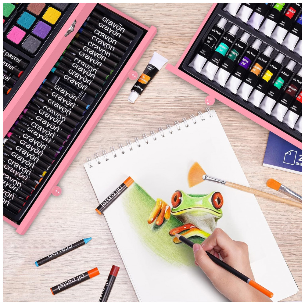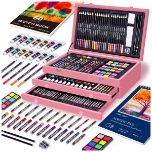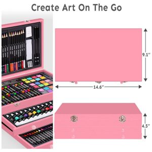 Kit Lápis de Cor Profissional com Maleta de Madeira 175 Peças e Tintas Acrílicas Aquarela Color More Rosa
