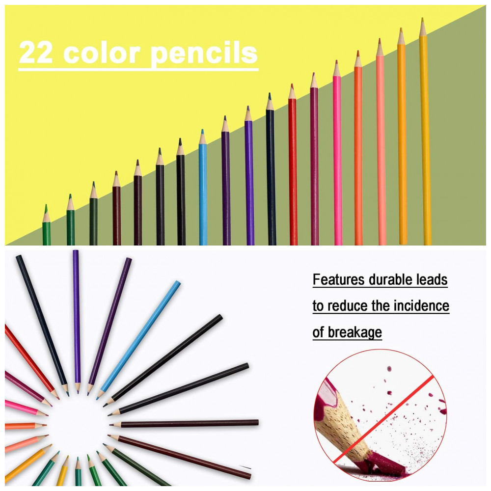 Inclui todas as ferramentas necessárias para um artista iniciante e artistas profissionais. Conjunto de arte perfeito para adultos e crianças. Contém 22 lápis de cor 40 pastéis de óleo 18 marcadores de ponta dupla 1 apontador de lápis 6 marcadores 18 bolos em aquarela 1 borracha 1 paleta 1 escova 4 folhas de papel para escrever 20 folhas de papel A5.