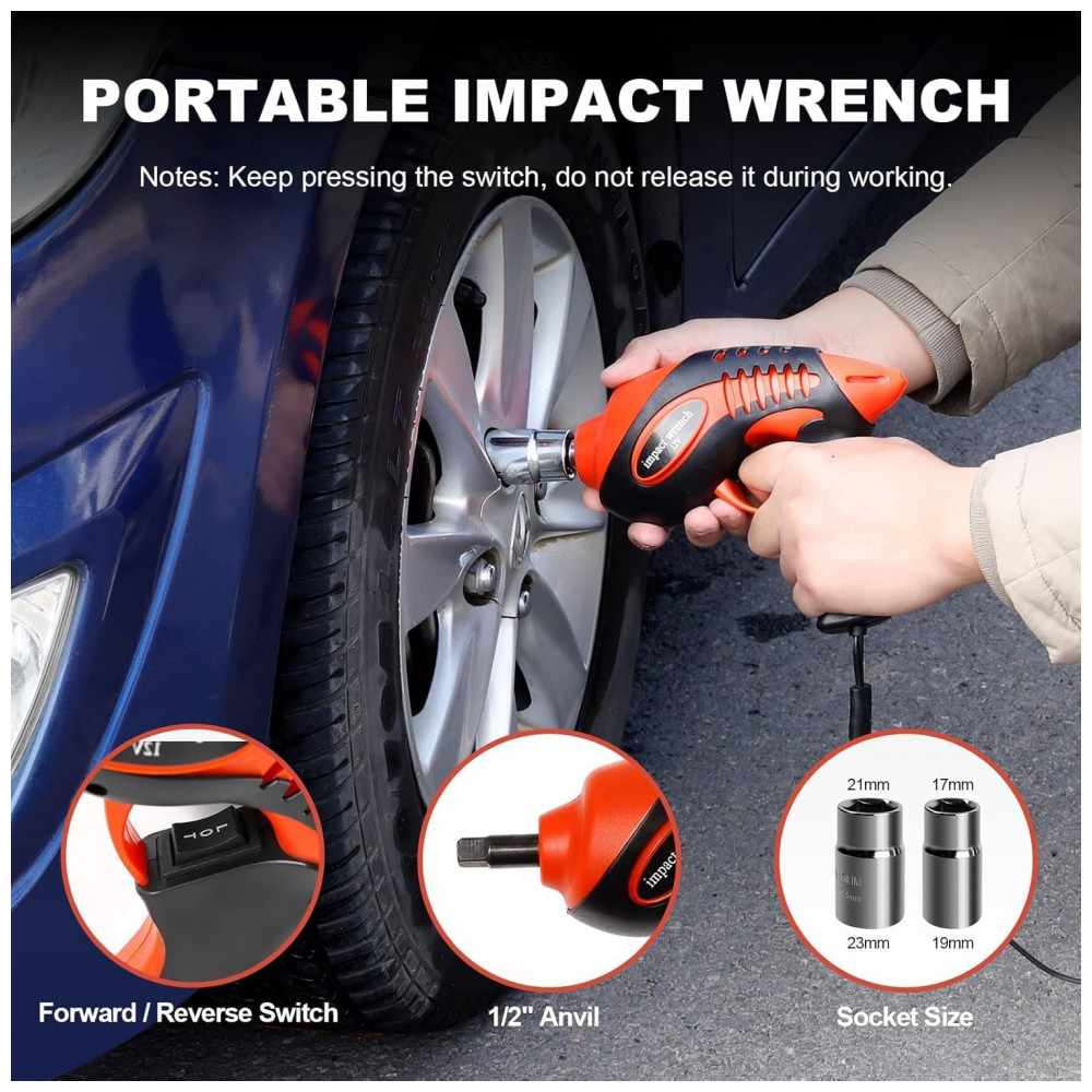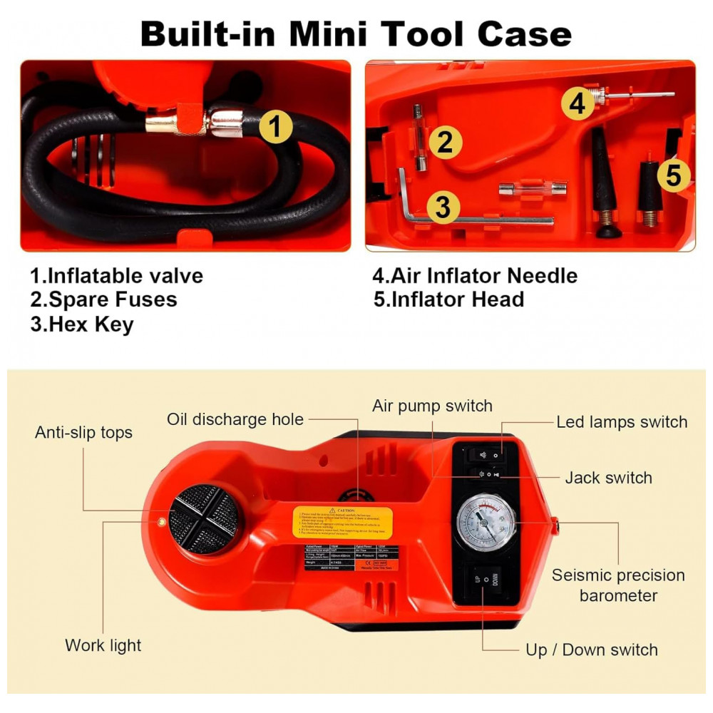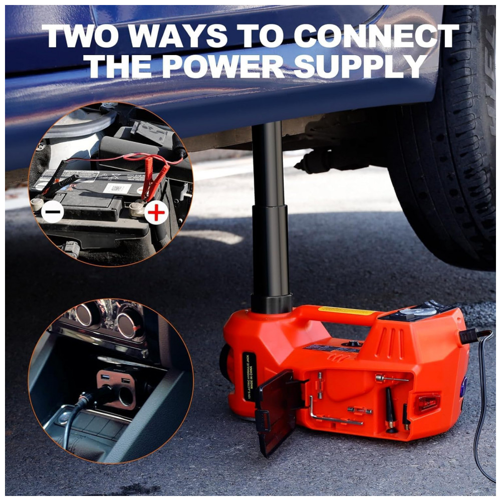 O Kit Macaco Elétrico 5 em 1 inclui macaco elétrico hidráulico, chave de impacto, bomba de ar, luz de advertência e luz LED principal, atendendo todas as suas necessidades de troca de pneus de uma só vez. O macaco levanta facilmente carros de até 5 toneladas, atingindo a altura máxima em cerca de 2 minutos, com faixa de altura de elevação de 15,5 a 45 cm. Com haste de pressão de aço de alta resistência, apresenta maior capacidade de suporte e motor DC lubrificado permanentemente que fornece energia suficiente. Interrompe automaticamente o funcionamento ao atingir a altura limite, pressão pré-definida ou sobrecarga. O dispositivo de autotravamento evita quedas do macaco, mantendo uma altura estável mesmo sem energia, garantindo a segurança do veículo e das pessoas. Com bomba infladora de pneus integrada, não precisa se preocupar com emergências de pneus furados no meio do nada. Equipado com display de pressão dos pneus, permite monitorar a pressão enquanto infla. Funciona com alimentação de energia do acendedor de cigarros ou bateria do carro, com cabo de 3,5 metros de comprimento, passando pelos 4 pneus sem precisar trocar a fonte de energia. NOTAS: Ligue o motor do carro antes da operação. Nunca use o macaco em terreno inclinado ou em veículos acima de 5 toneladas.