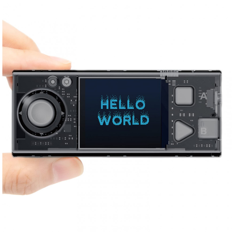 Itens principais: 1 CyberPi, 1 Pocket Shield com bateria de 800 mAh, cabos e acessórios estruturais (compatíveis com Makeblock e LEGO Technic)