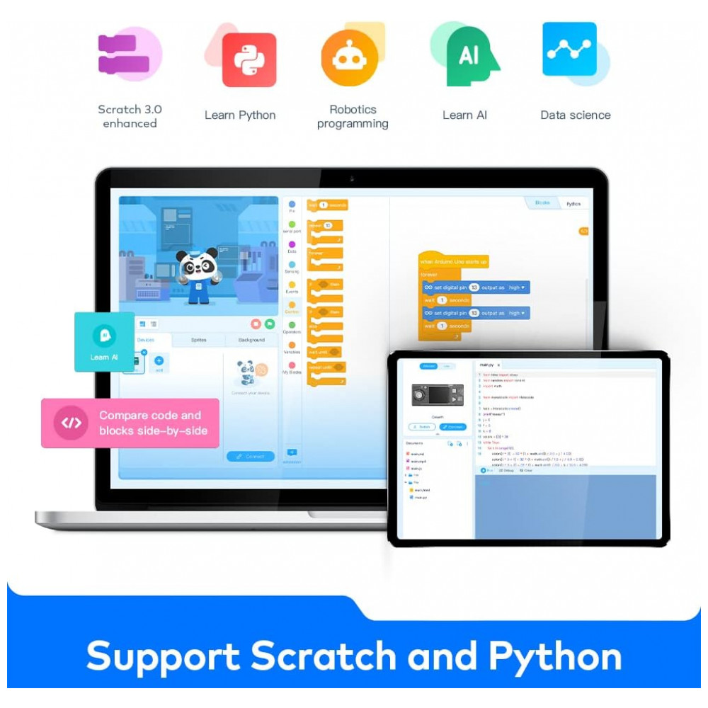 Programação suportada: Scratch (mBlock, programação em blocos) e Python, com suporte em Windows, macOS, Linux, Chromebook e dispositivos móveis