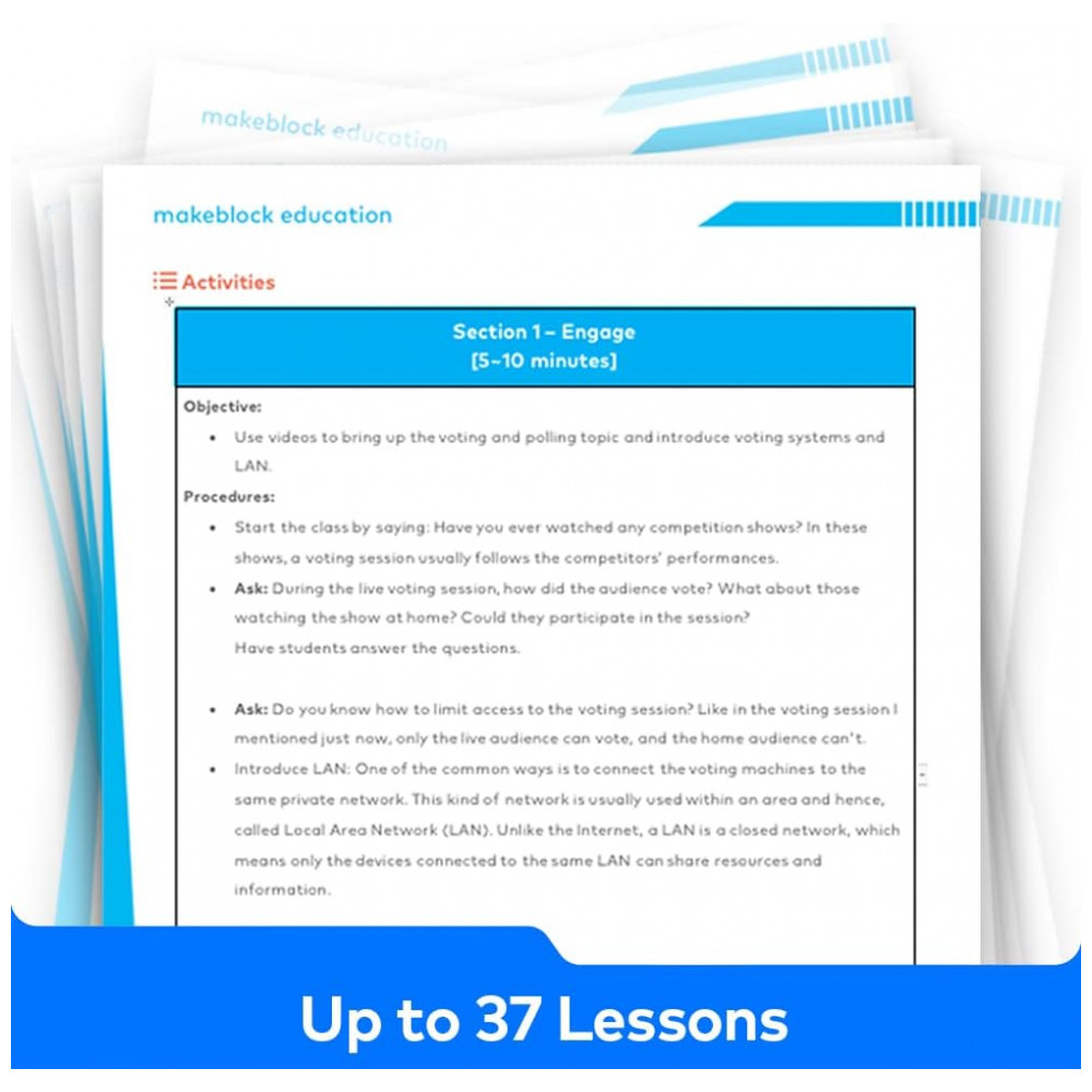 Conteúdo educacional: Cerca de 12+ cursos básicos no site da Makeblock e até 37 lições passo a passo no kit, com projetos como lixeira inteligente, veículo autônomo, jogos com controle por movimento etc.