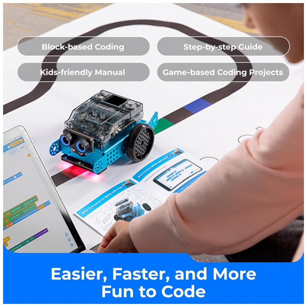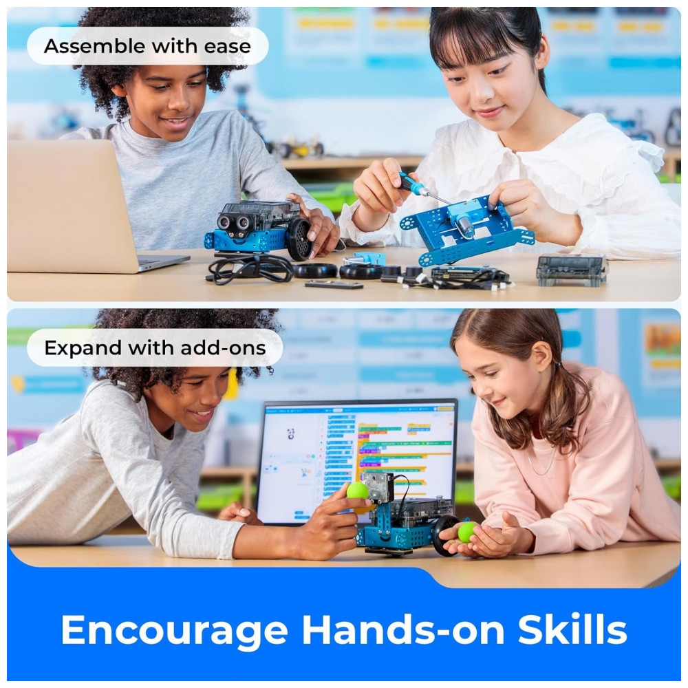 Possui suporte às plataformas mBlock (Windows, Mac, tablets e celulares) e aplicativos para controle remoto, jogos e desafios. É ideal para escolas e famílias que buscam um recurso seguro, robusto e com apoio didático contínuo.