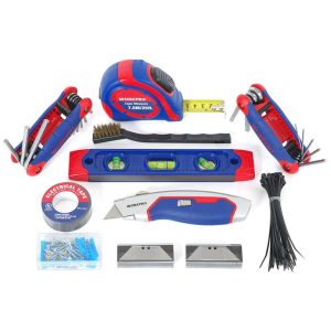 Conjunto de ferramentas básicas de 322 peças para tarefas diárias e reparos ferramentas de aço cromo vanádio com tratamento térmico para maior resistência e durabilidade Embalado em saco de nylon durável de 18 para fácil e flexível zenamento inclui martelo, nível, fita métrica, faca, alicate, chaves de fenda, chaves sextavadas, braçadeiras de cabos, conjuntos de soquete Todas as ferramentas atendem ou excedem os padrões críticos ANSI