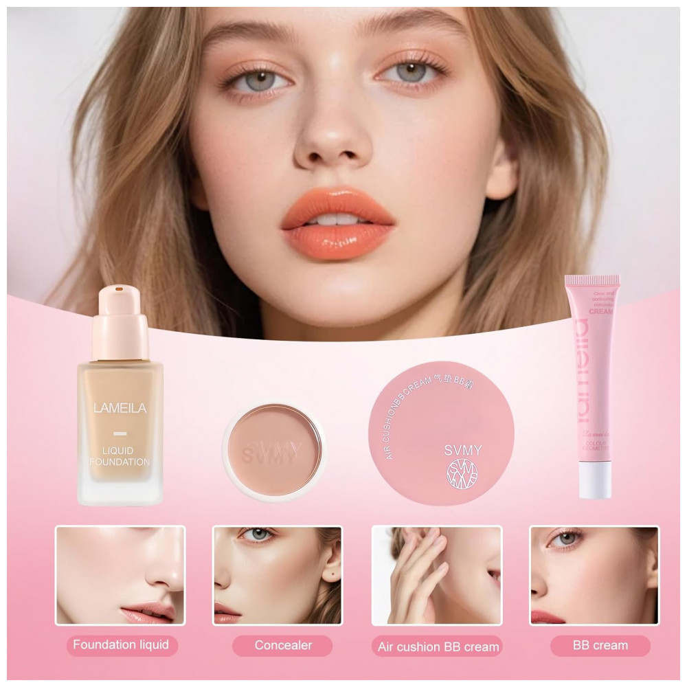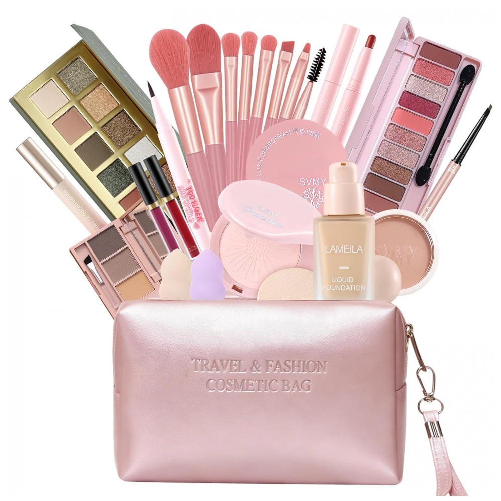 Kit maquiagem tudo em um com 25 peças Fynqwor, incluindo base, corretivo, paleta de sombras, gloss labial e acessórios para aplicação completa facial. Conjunto projetado para organização em bolsa portátil com design funcional para transporte diário ou viagens.