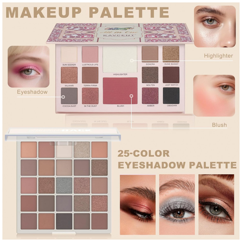 Kit maquiagem tudo em um Kavcent com paleta de maquiagem multifuncional, paleta de sombras, gloss labial, foundation líquida, corretivo, máscara, lápis para sobrancelhas, delineador, puff de pó e conjunto de pincéis para aplicação facial completa.