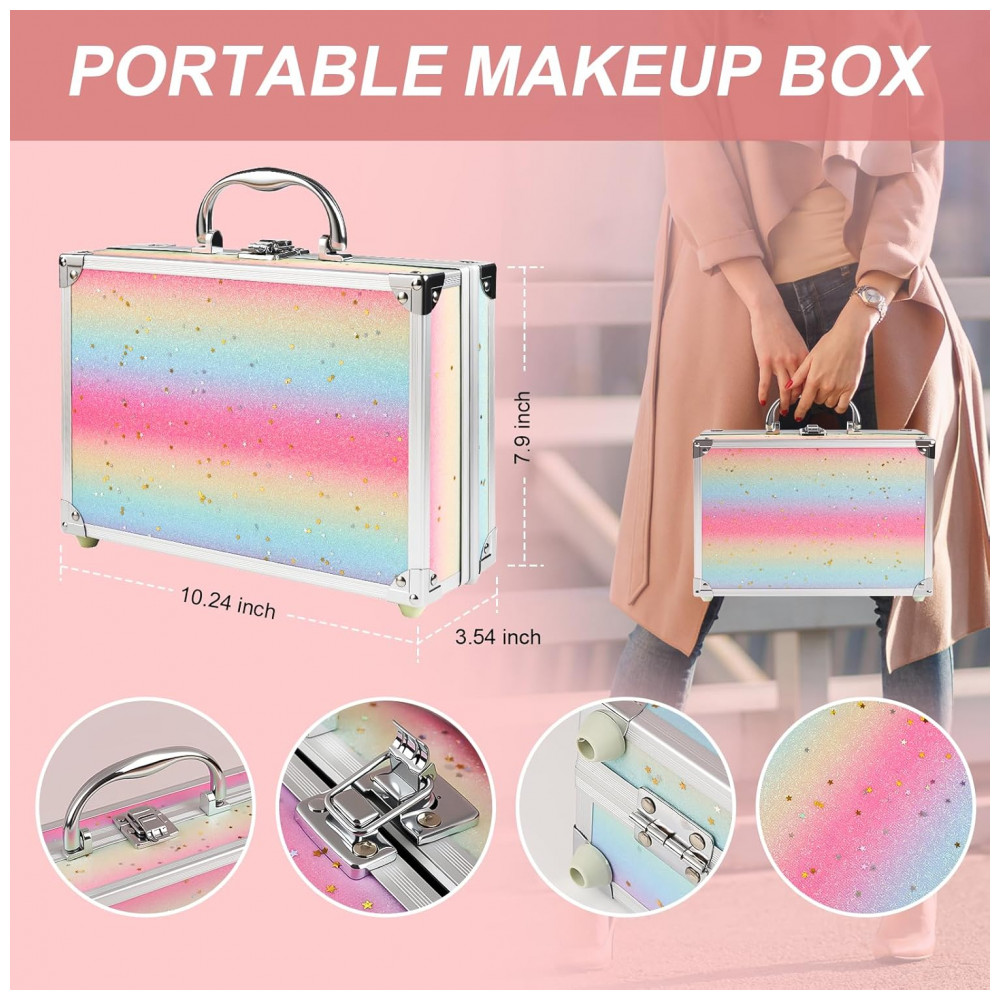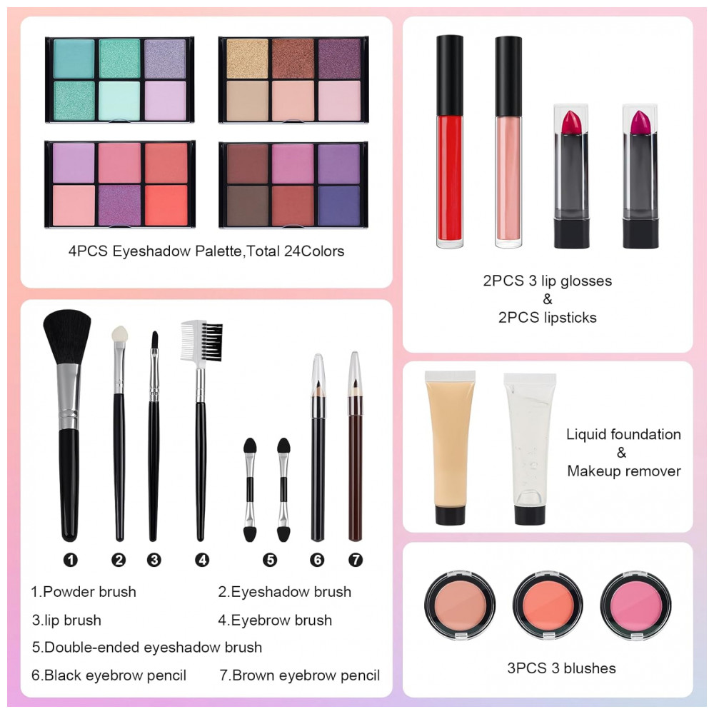 Kit maquiagem completo tudo em um Mileonaim para aplicação de looks variados, incluindo paleta de sombras com 24 cores, gloss labial, blush, iluminador e ferramentas essenciais como pincéis. Projetado para portabilidade com estojo rígido multifuncional para armazenamento e transporte de cosméticos.