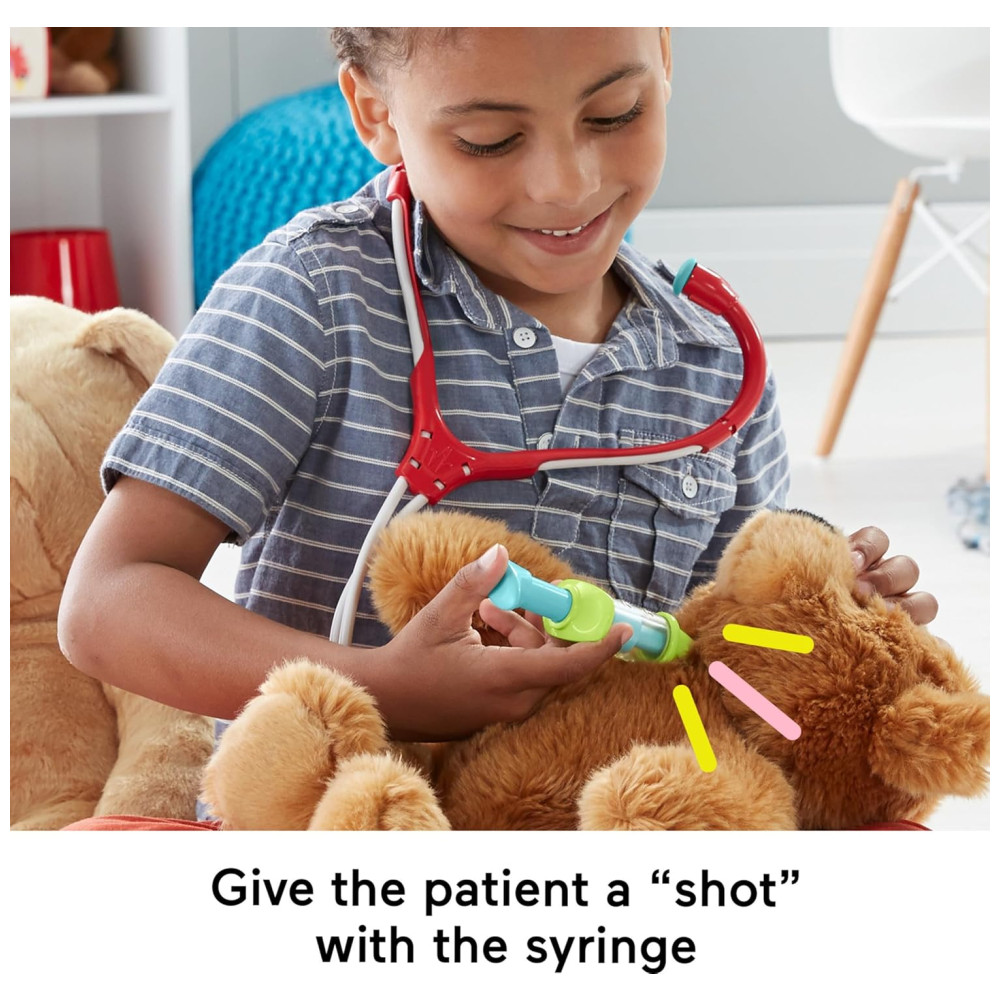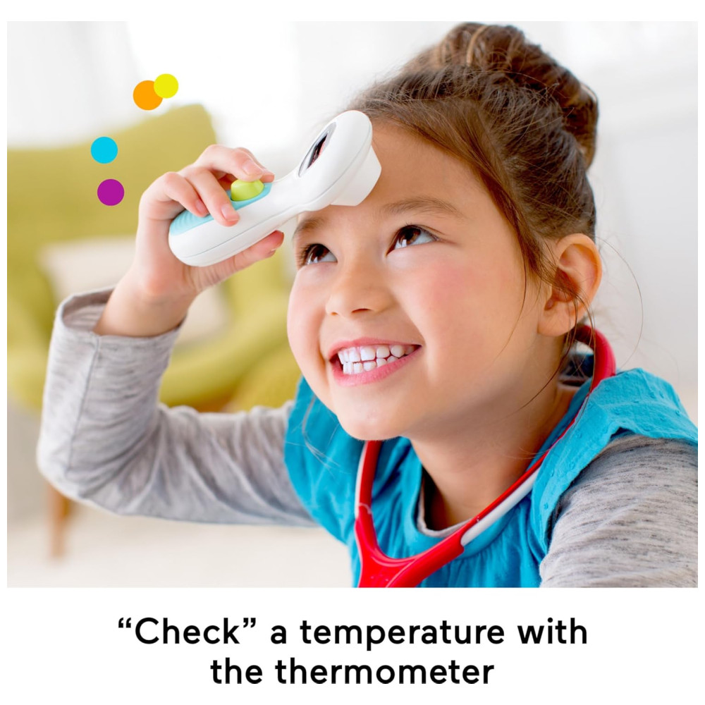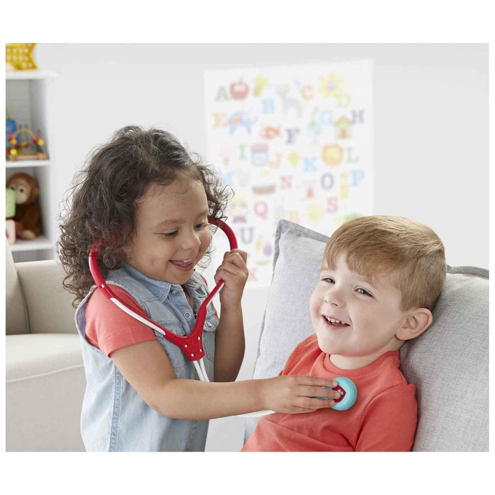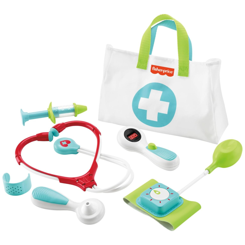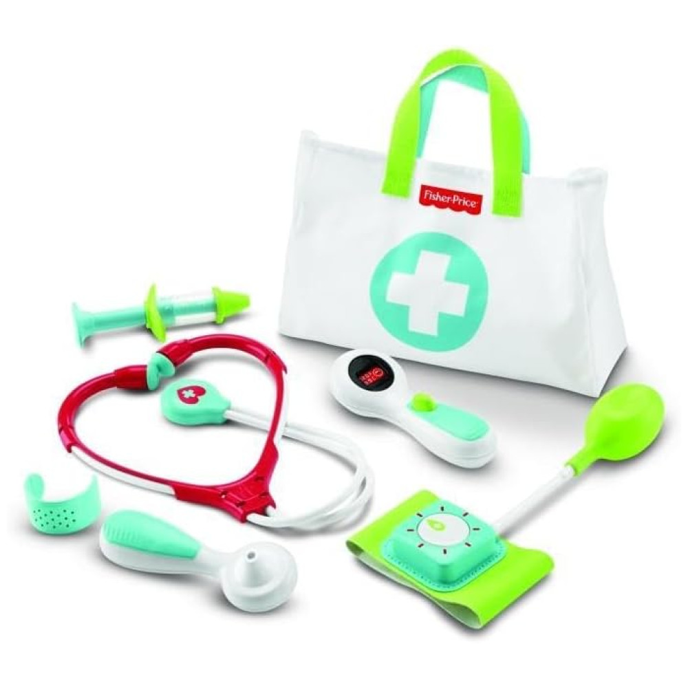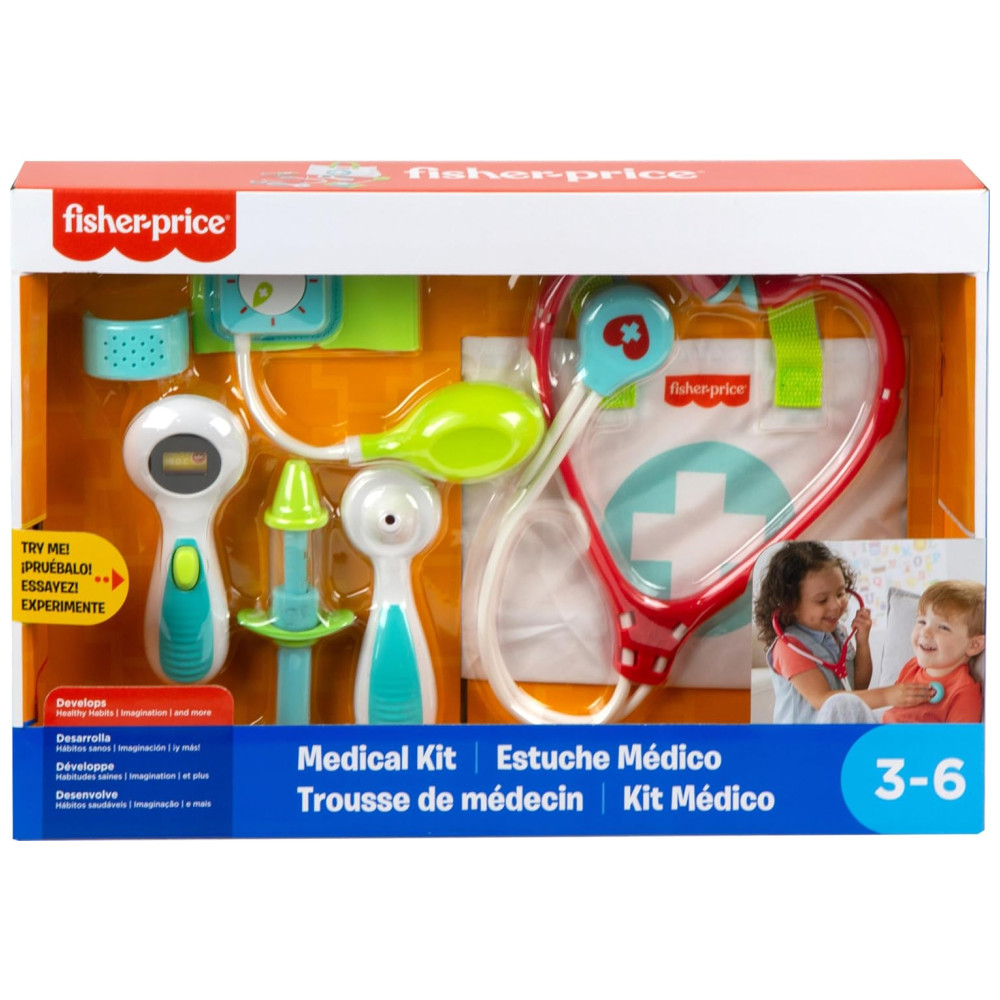 Kit Médico Fisher-Price com 7 peças para brincar de médico. Ideal para crianças a partir de 3 anos. Inclui bolsa e acessórios em tamanho infantil.