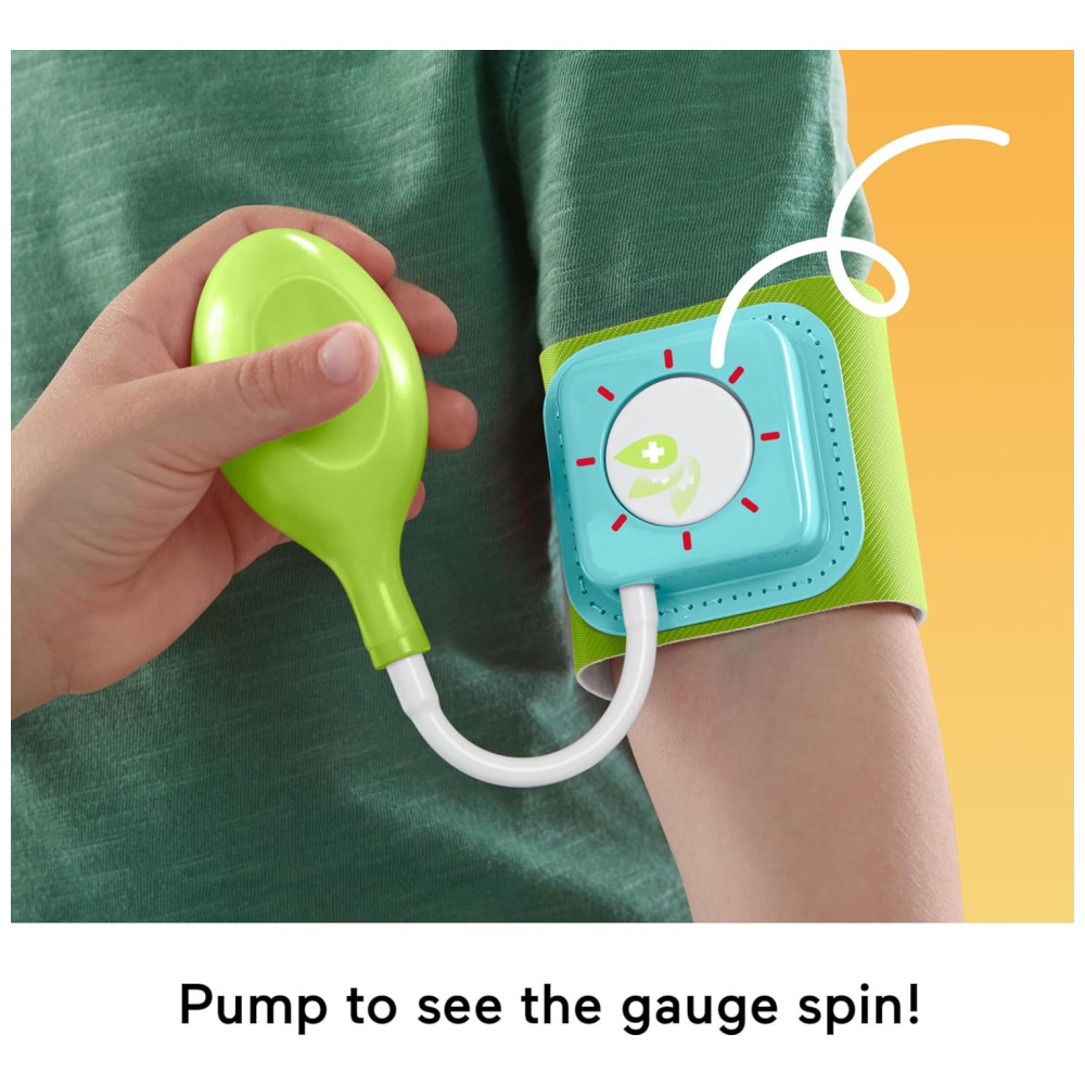 Kit de médico para brincar com 7 peças: estetoscópio, braçadeira de pressão arterial, termômetro, otoscópio, seringa, curativo e bolsa de tecido. Pressione o botão do termômetro para alternar entre “doente” e “saudável”. Bombeie a braçadeira para ver o medidor girar. Todas as peças podem ser guardadas na bolsa, facilitando levar para onde quiser. Estimula o faz de conta, hábitos saudáveis e a empatia em crianças a partir de 3 anos, incentivando o cuidado com os outros.