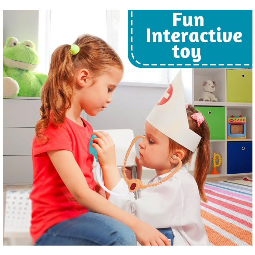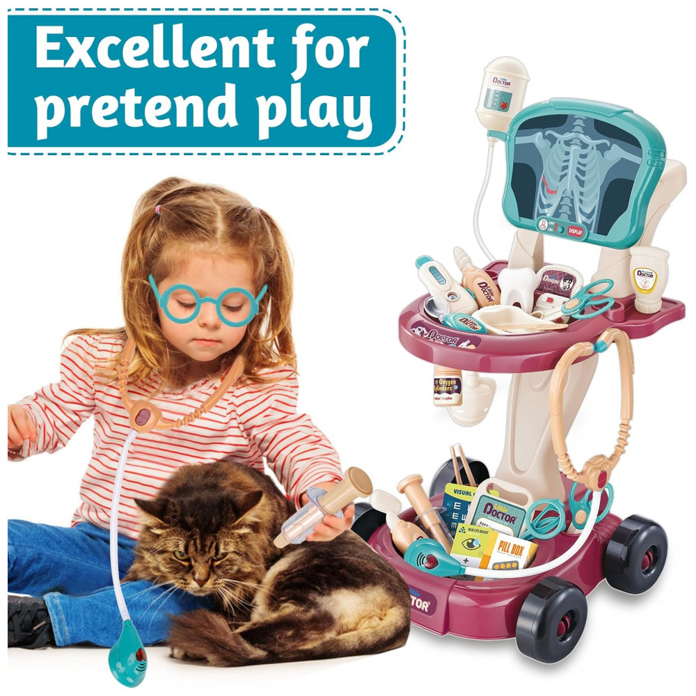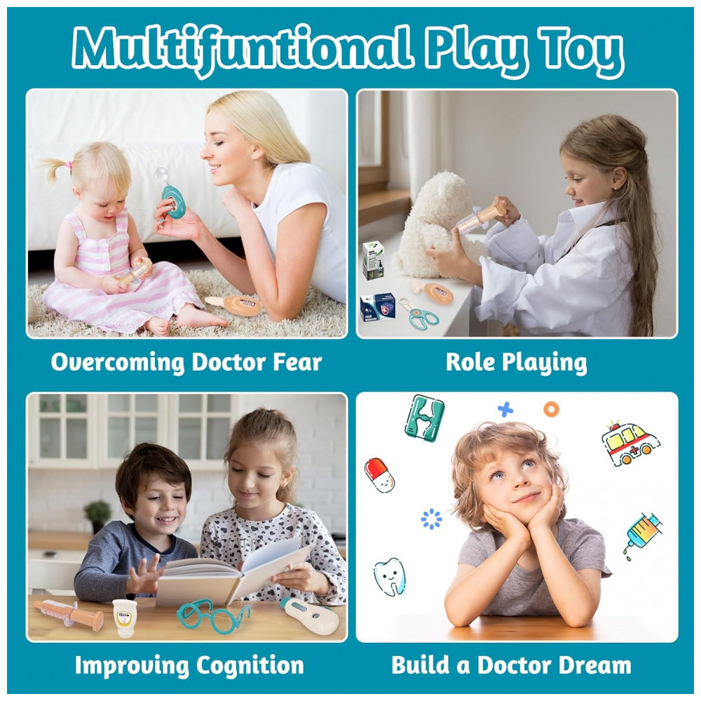 Durante a brincadeira, o kit estimula imaginação, linguagem e habilidades sociais ao permitir que a criança desempenhe papéis de médico, dentista ou veterinário em situações fictícias. O uso dos instrumentos desenvolve coordenação motora fina, organização (ao guardar os itens no carrinho) e compreensão básica de rotinas de cuidado e exame, o que pode contribuir para reduzir a ansiedade em consultas reais.