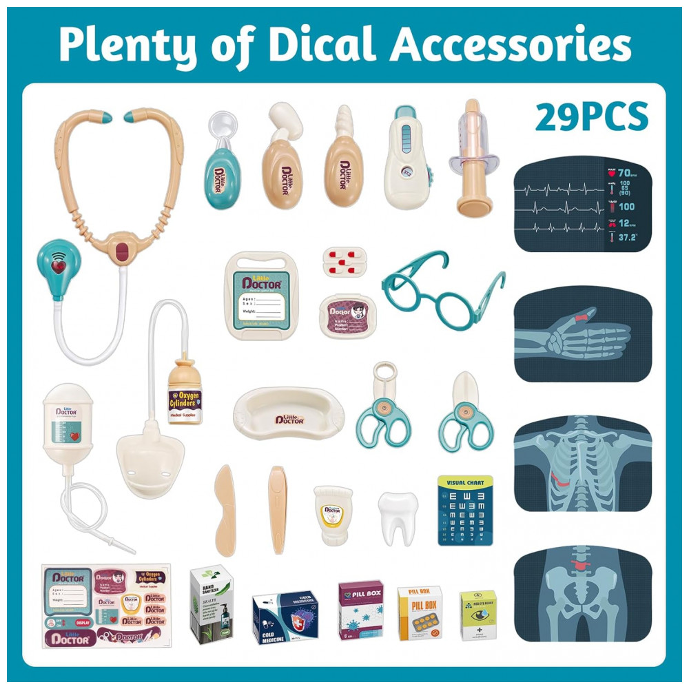 O kit médico infantil Tsomtto 29 peças é um conjunto de faz de conta com carrinho móvel de dois níveis e diversos acessórios médicos de brinquedo, ideal para simular atendimentos médicos, odontológicos e veterinários. O carrinho funciona como estação móvel, permitindo armazenar todos os instrumentos e empurrar a “clínica” pela casa, enquanto o estetoscópio e o módulo de raio X possuem efeitos de luz e som que simulam batimentos cardíacos e exames de imagem. O conjunto inclui itens como estetoscópio, seringa com ação de mola, termômetro ajustável, óculos, pinça, tesoura e outros instrumentos em plástico resistente, dimensionados para o manuseio por crianças pequenas.