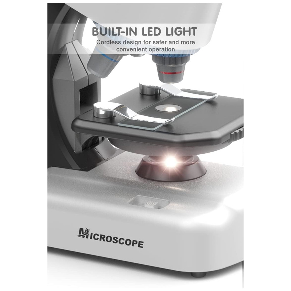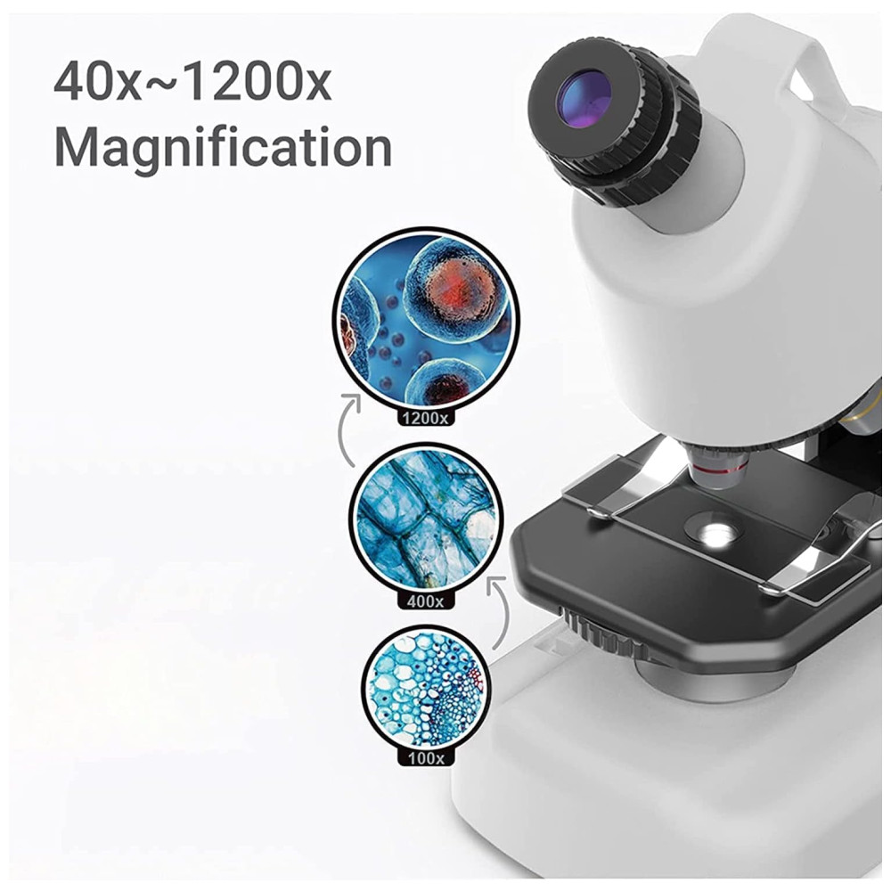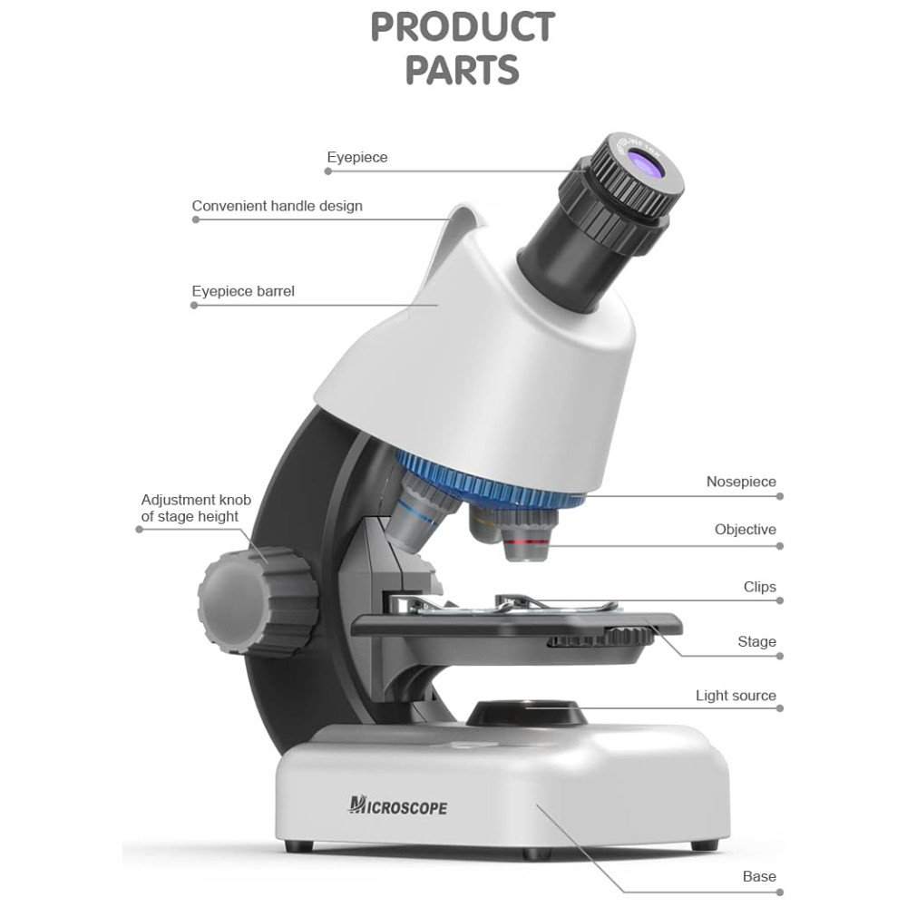 Kit Microscópio até 40 Zomm 1200x com Lâminas Preparadas e Luz LED Embutida para Crianças 5 a 12 Anos HYRENEE Branco