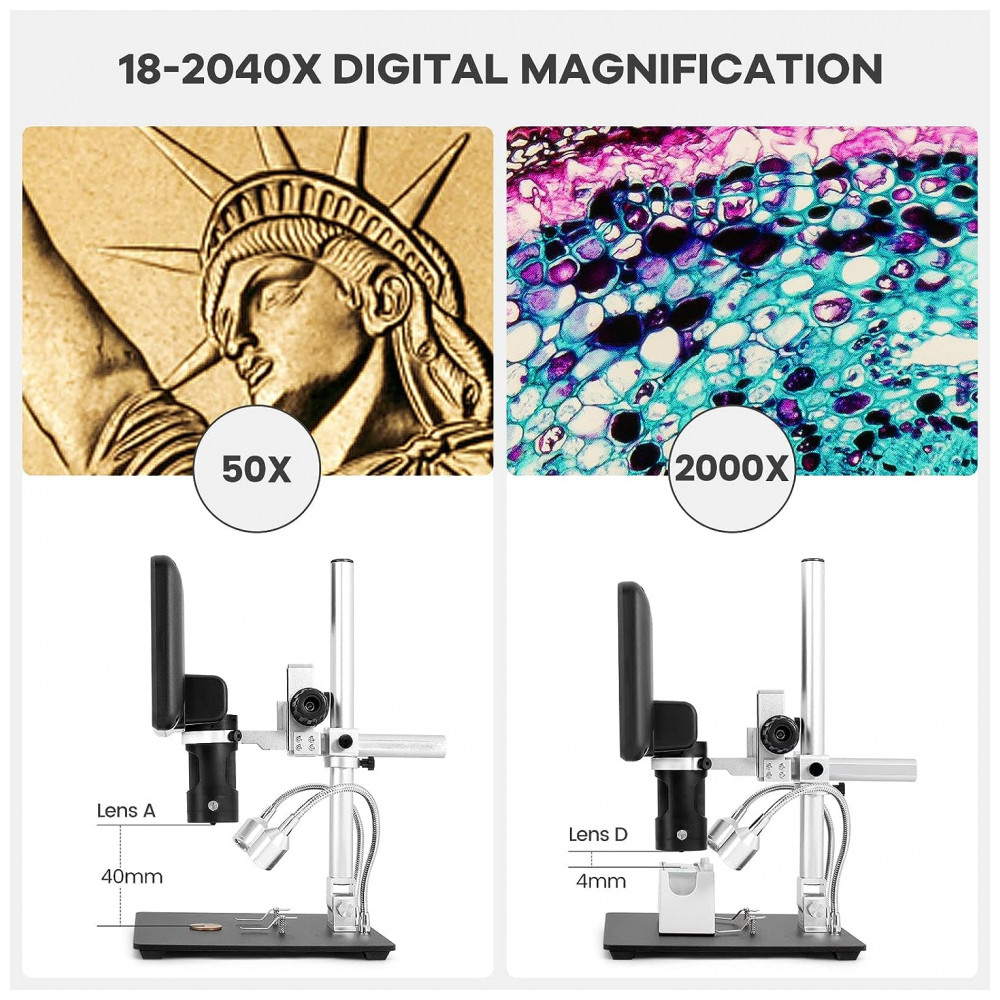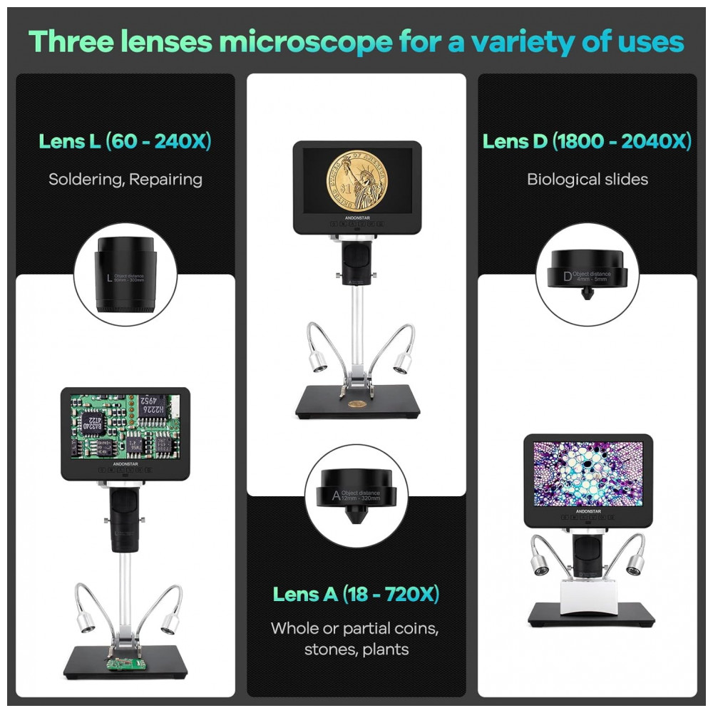 Microscópio digital de múltiplas lentes para adultos Lente L 60 240x para solda e reparo pode ser para reparar placas de circuito, telefones celulares, etc. Lente A 18 720x, pode ser para observar moedas inteiras ou peças, plantas, pedras, etc. Lente D 1800 2040x, pode ser usada para observar lâminas biológicas.