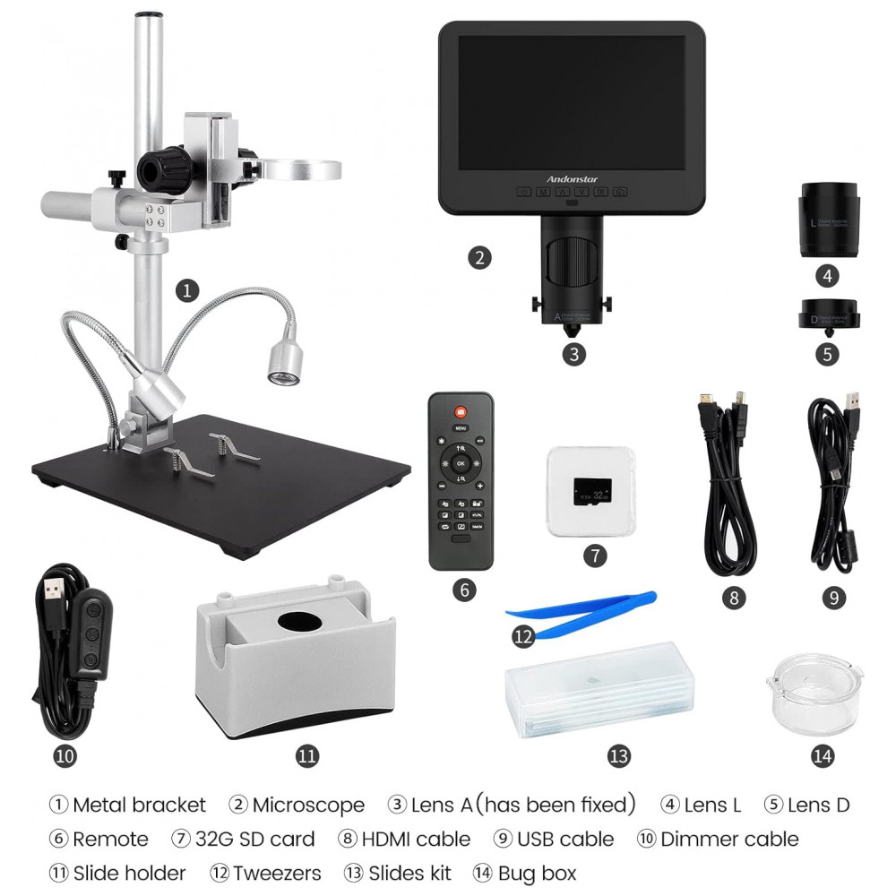 O que você pode obter 1x host do microscópio, 1x LensA, 1x LensD, 1x LensL, 1x suporte para slides, 1x 32GMicro SD card, 1x cabo USB, 1x cabo Switch, 1x cabo HDMI, 1x controle remoto, 5x slides preparados, 1x Caixa de observação, 1x Pinça, 1x Instrução,