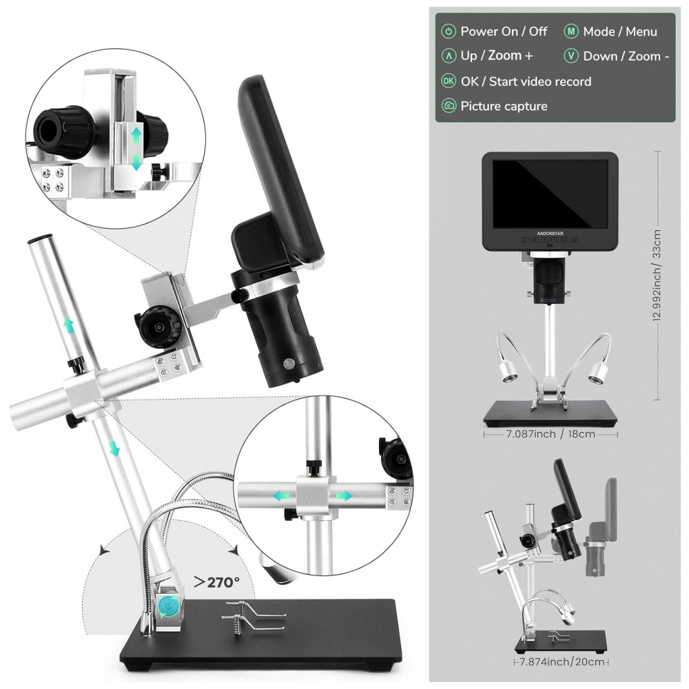 Microscópio de solda com suportes de metal profissional O mais suporte atualizado da Andonstar, tamanho 17 x 17 x 33 centímetros, o suporte é frontal e traseiro ajustável, esquerdo e direito, e o ângulo do suporte é ajustável. Atenda às necessidades de seu envelope de trabalho maior. Material de metal forte, adequado para ambientes de alta temperatura, como solda.