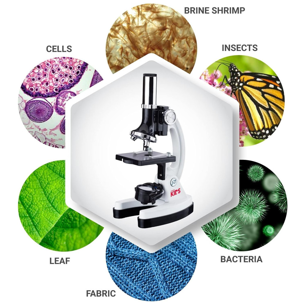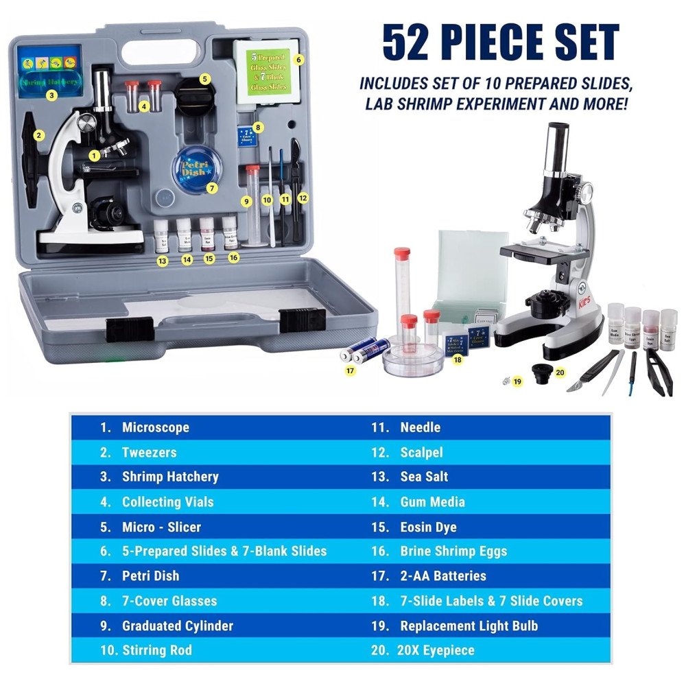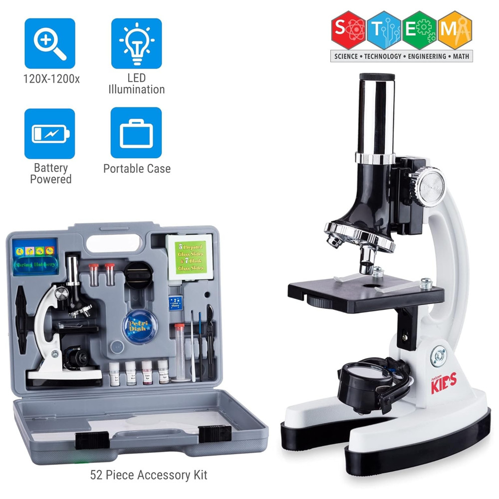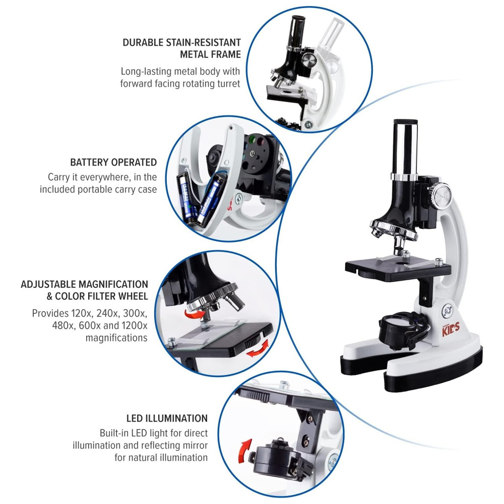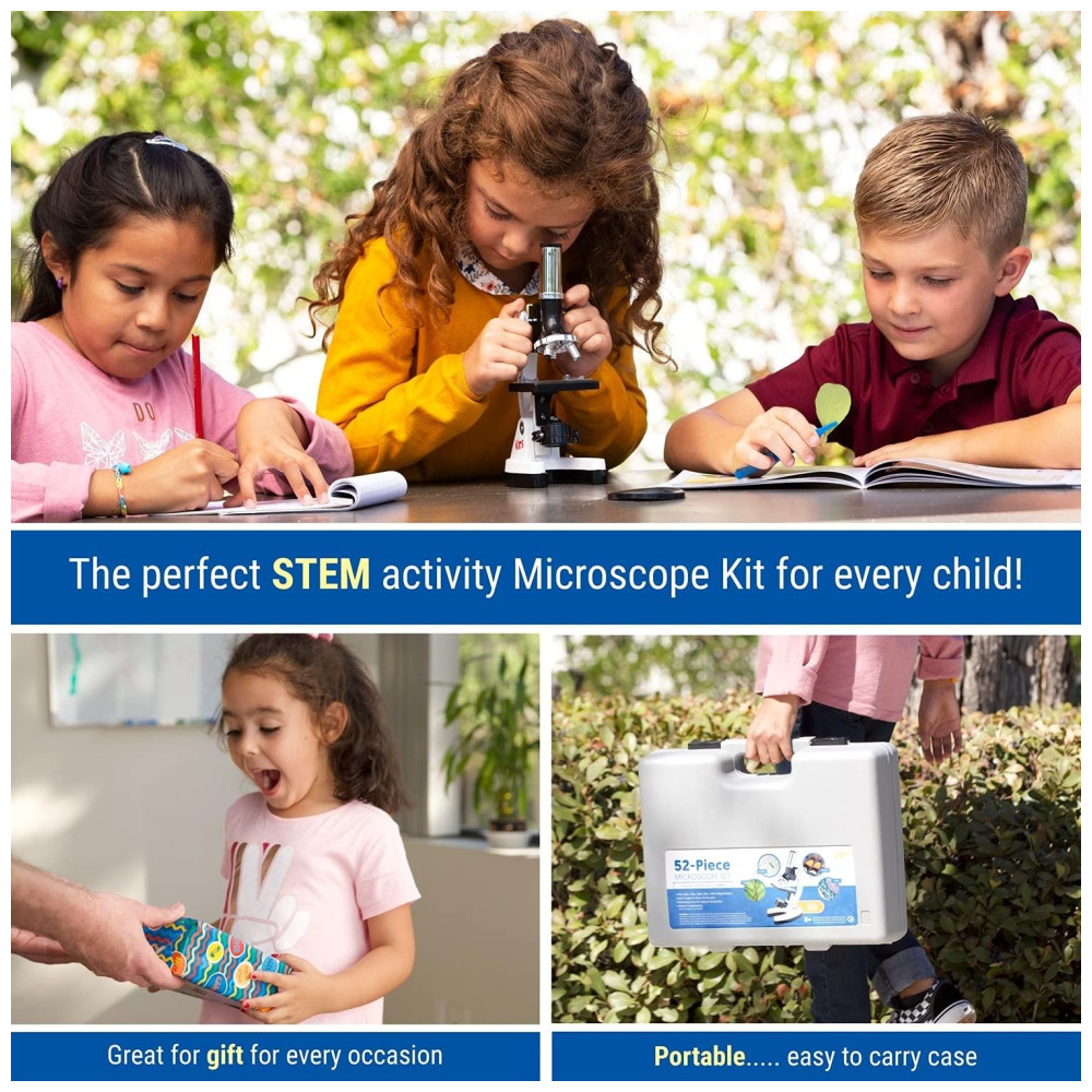Kit Microscópio de Metal 120X 1200X 5 com Maleta de Transporte Luz LED para Crianças AMSCOPE M30 ABS KT2 W Branco
