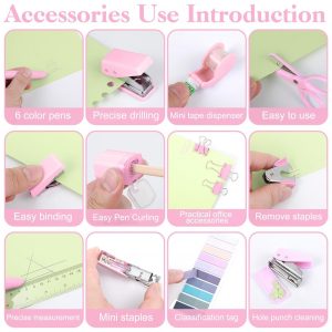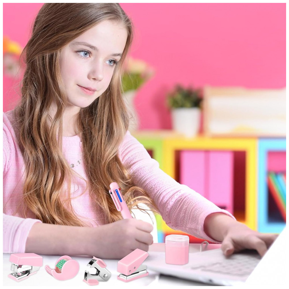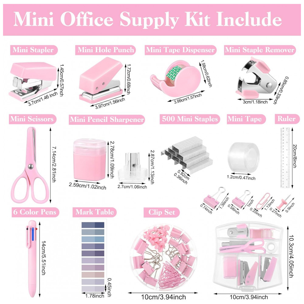 Kit mini escritório auroray rosa com grampeador furador dispenser de fita clips e bloco de notas