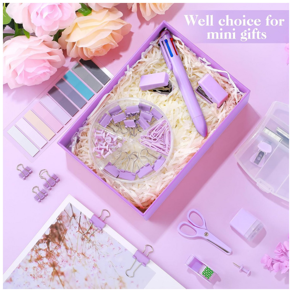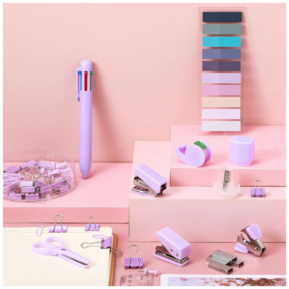 Kit mini escritório auroray roxo com grampeador furador dispenser de fita clips e bloco de notas
