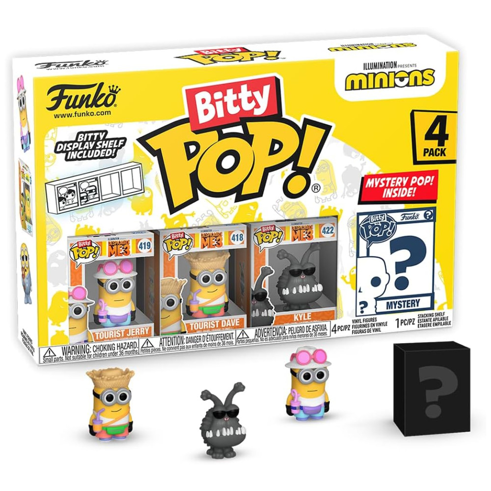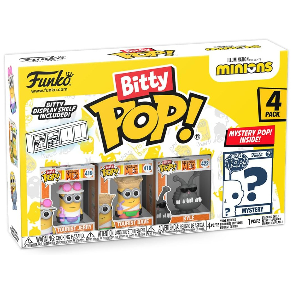 Expanda sua coleção de Minions com este pacote exclusivo de 4 figuras Bitty Pops! O conjunto inclui o Bitty Pop Turista Dave, o Bitty Pop Turista Jerry, o Bitty Pop Kyle e uma figura misteriosa Bitty Pop. Além disso, a figura misteriosa pode ser um dos quatro possíveis Bitty Pops raros: Hyper Rare 16 King Bob, Hyper Rare 16 Pet Rock Otto, Rare 13 Mummy Stuart ou Rare 13 Fluffy.