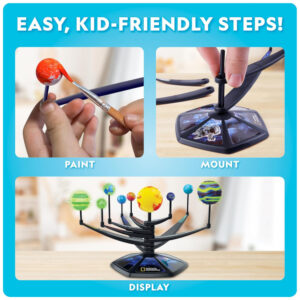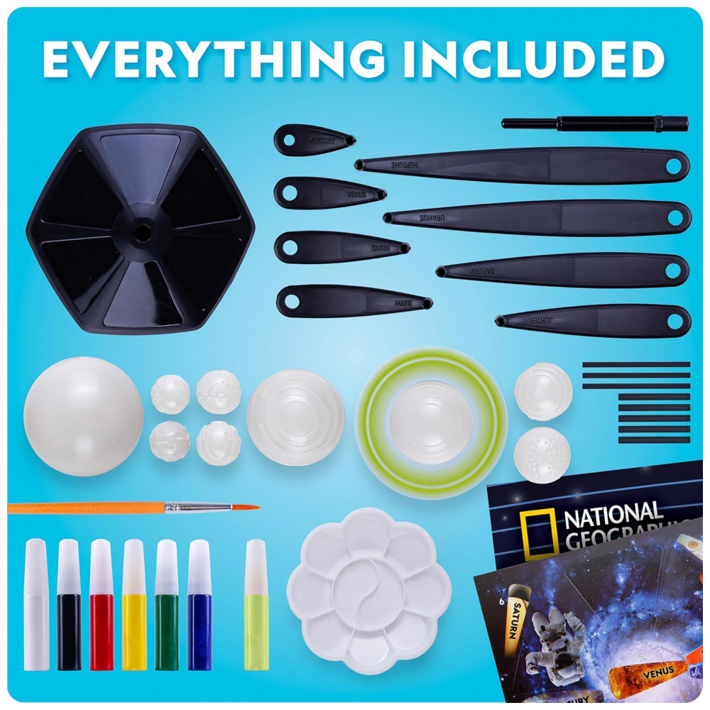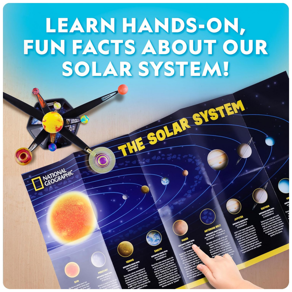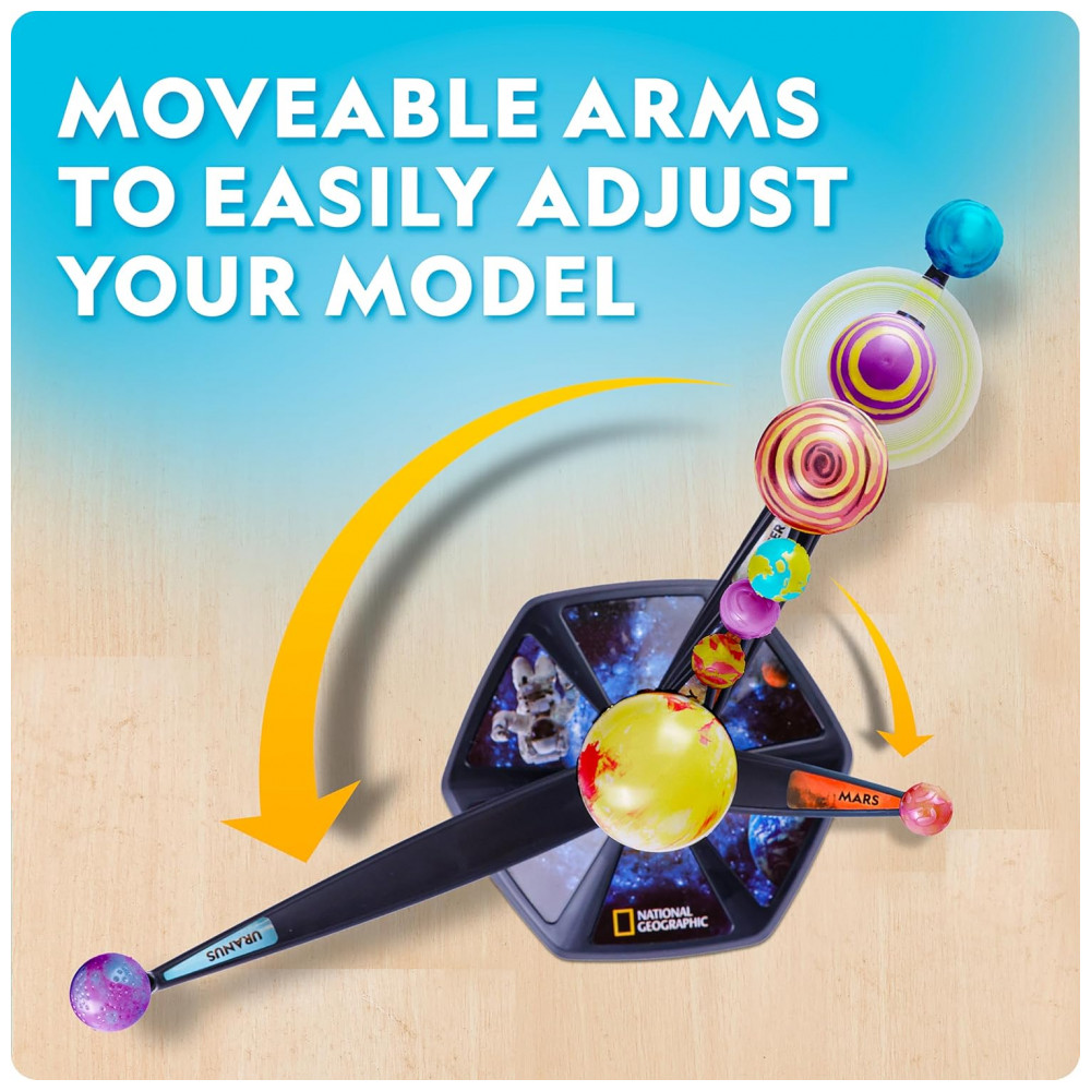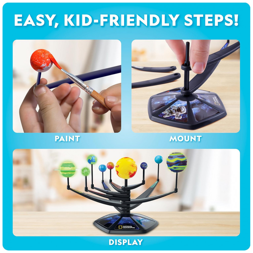 O Kit Modelo 3D do Sistema Solar que Brilha no Escuro da National Geographic permite que crianças montem e pintem um modelo impressionante dos oito planetas e do Sol, com braços móveis que tornam possível controlar a disposição do sistema solar conforme a imaginação da criança.