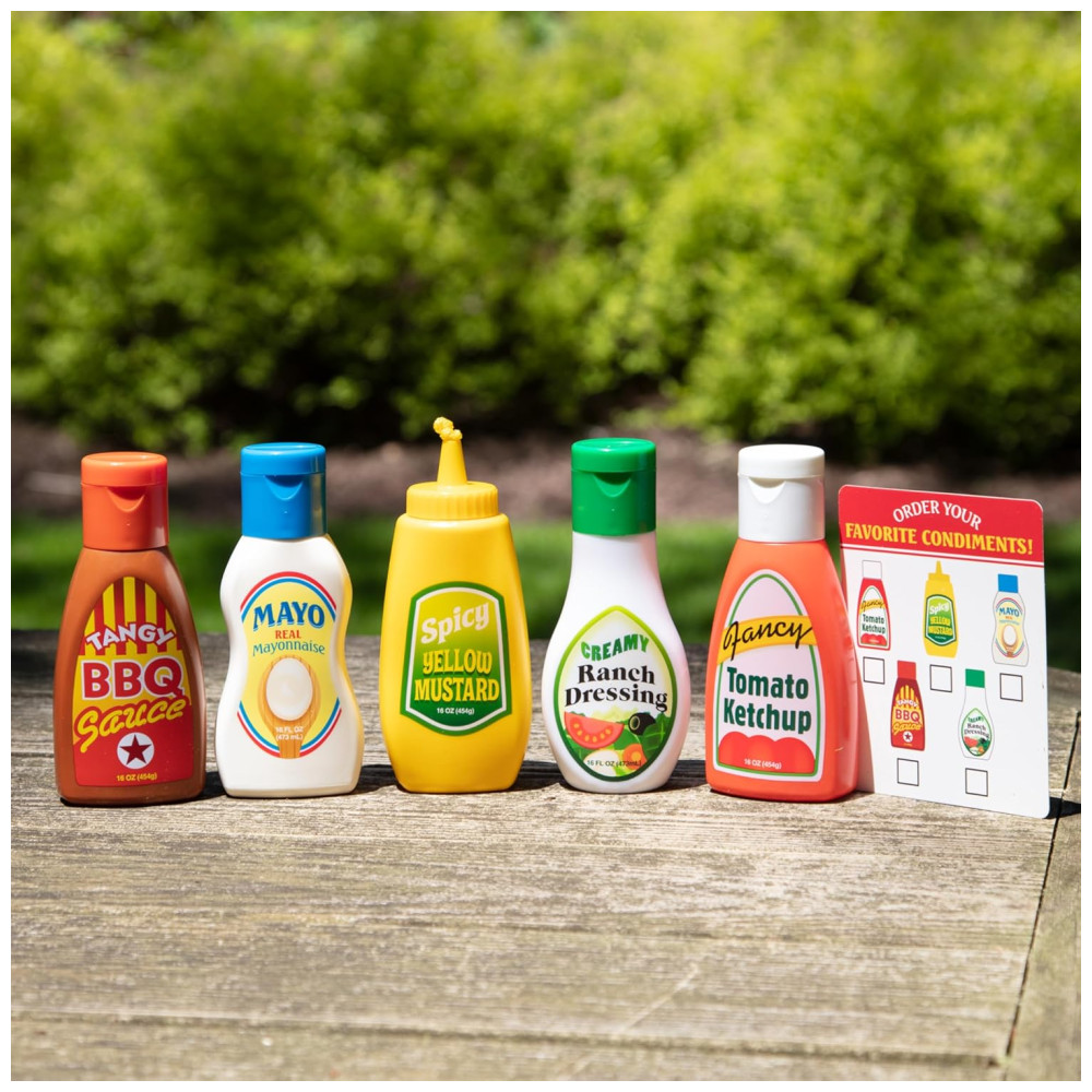 Anos e acima. Este conjunto de enfeites de comida é perfeito para piqueniques, churrascos e outras refeições divertidas. Os recipientes duráveis são projetados para parecerem reais e contêm molho ranch, molho barbecue, mostarda, maionese e ketchup. Ao torcer ou virar as tampas, os condimentos esguicham em forma de barbante para adicionar um toque criativo a carnes, saladas, sanduíches e muito mais.