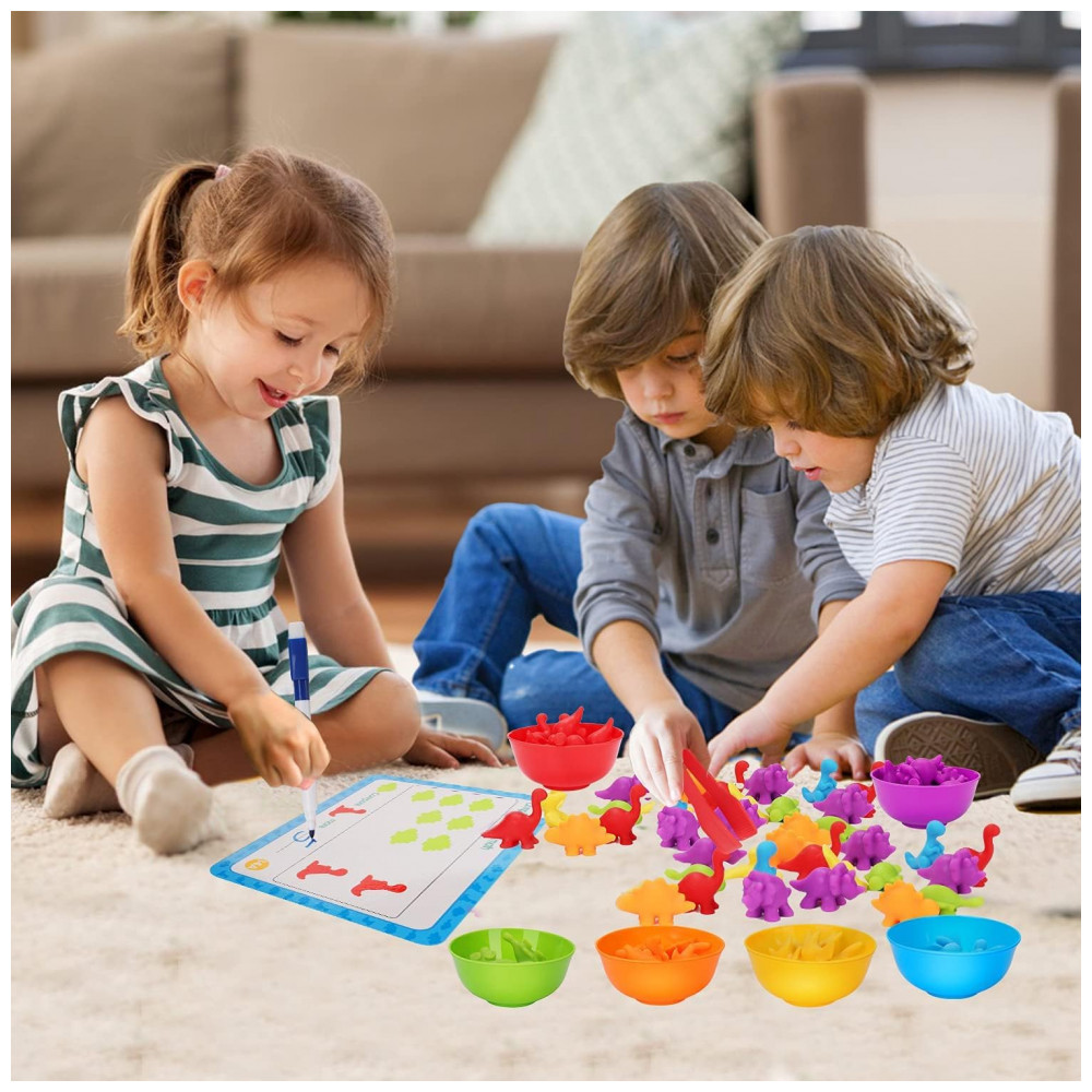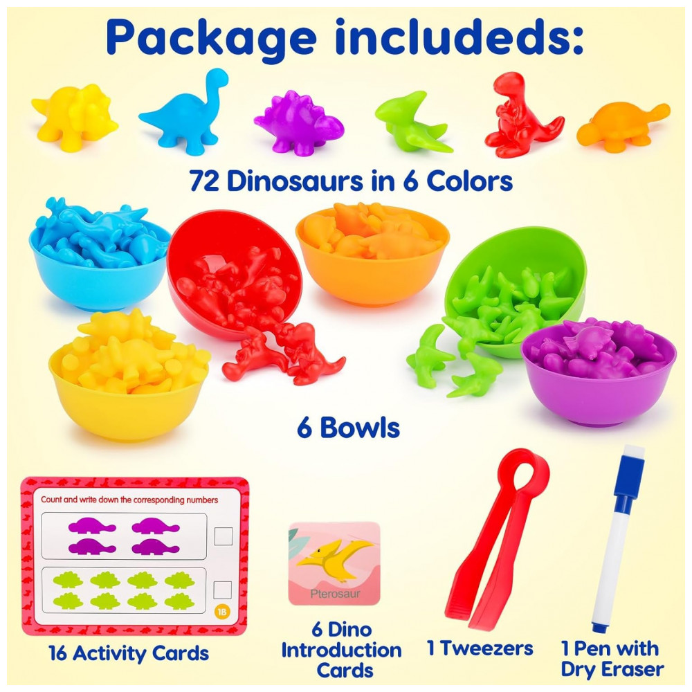 Kit Montessori Dinossauros para Contar Tsomtto com 72 Peças Cartas de Atividades e Tigelas de Classificação para Crianças de 3 a 5 Anos