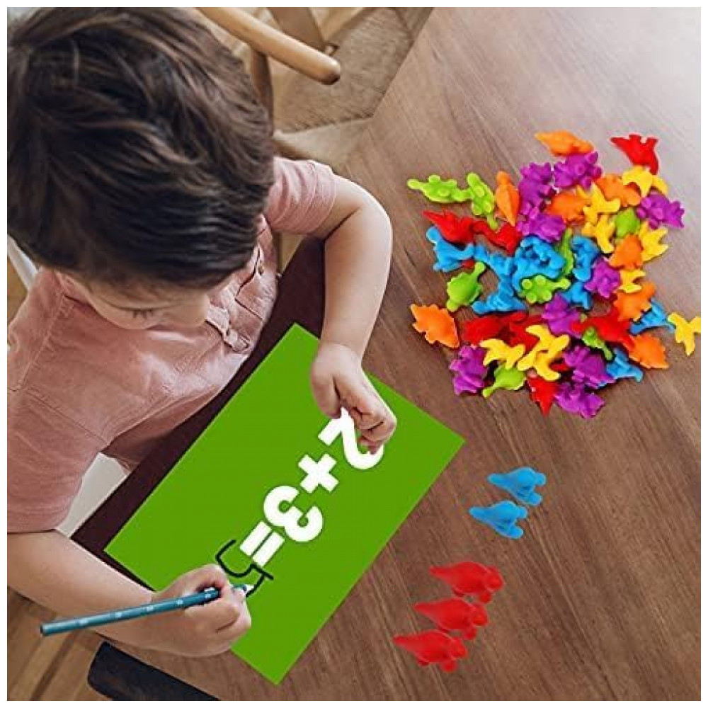 O kit Montessori de contagem de dinossauros Tsomtto é um conjunto educativo composto por mini dinossauros plásticos coloridos, tigelas de classificação, cartas de atividades e ferramentas de manipulação, desenvolvido para atividades de matemática inicial e coordenação motora fina na educação infantil. O conjunto inclui 72 dinossauros em cores variadas, 6 tigelas de plástico, 15 cartas de jogo com desafios, 1 carta de respostas, 6 pequenos cartões educativos, 1 pinça e 1 caneta apagável, permitindo organizar diferentes propostas de contagem, agrupamento, comparação e padrões numéricos. As peças são produzidas em plástico resistente, com superfícies lisas e cantos arredondados, adequadas para uso por crianças pequenas em casa ou em contexto de sala de aula.