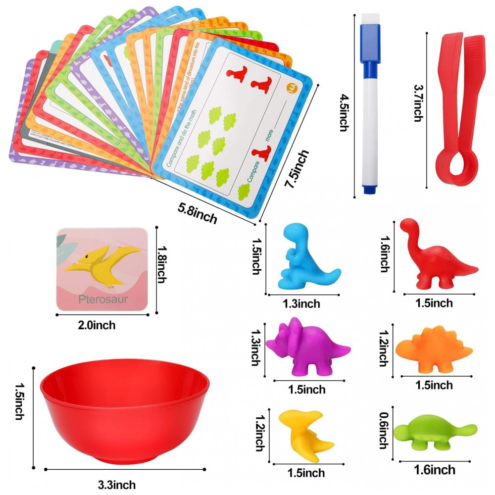 Conteúdo da caixa: 72 dinossauros coloridos, 6 tigelas de classificação, 15 cartas de atividades, 1 carta de respostas, 6 pequenos cartões educativos, 1 pinça e 1 caneta apagável