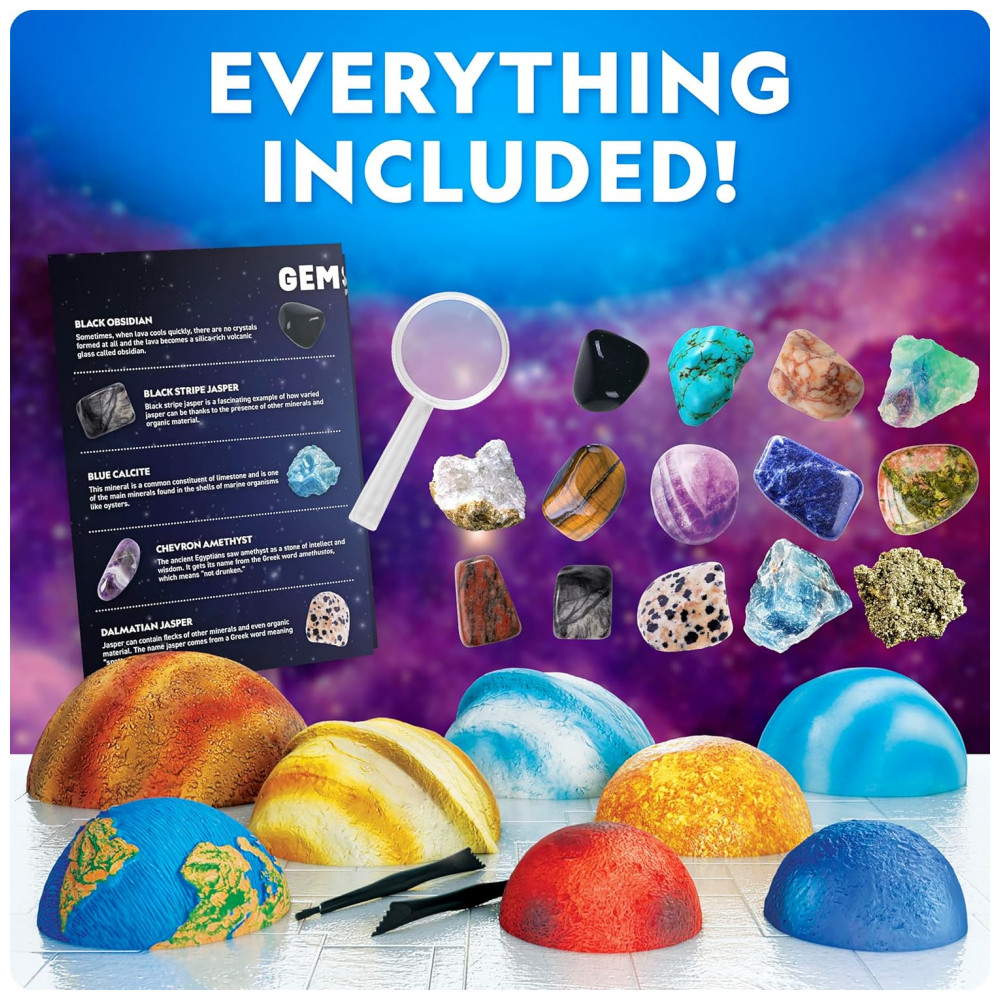 Componentes incluídos: 8 planetas em blocos, 16 amostras de pedras e gemas, 2 ferramentas de escavação, lupa, pôster educativo