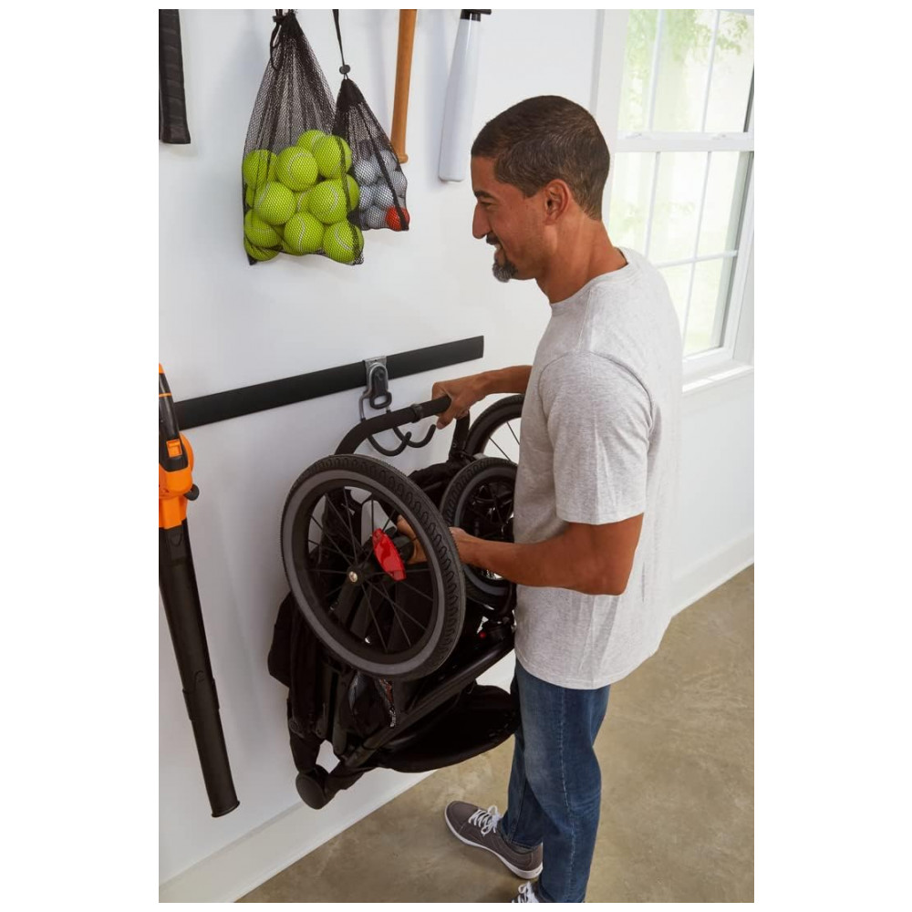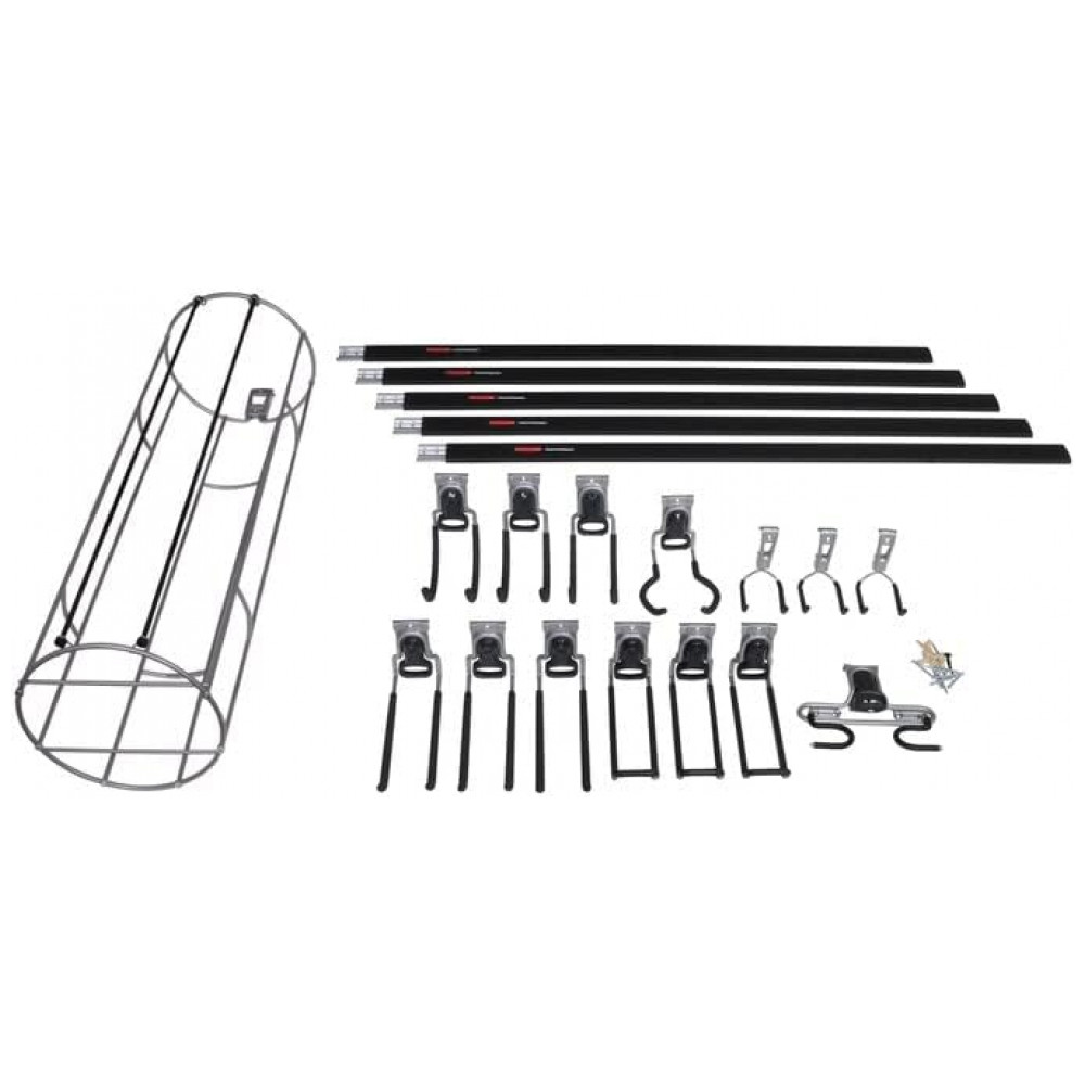 O kit inclui cinco trilhos de 121,92 centímetros, três ganchos multifuncionais, três ganchos utilitários, três ganchos de escada, três ganchos para refrigeradores, um porta ferramentas elétricas, um gancho com duas alças e um suporte vertical para bolas. As dimensões do item são 124,46 centímetros de comprimento, 33,02 centímetros de largura e 15,24 centímetros de altura. Esses componentes permitem que você organize facilmente uma variedade de itens, maximizando o espaço da sua garagem