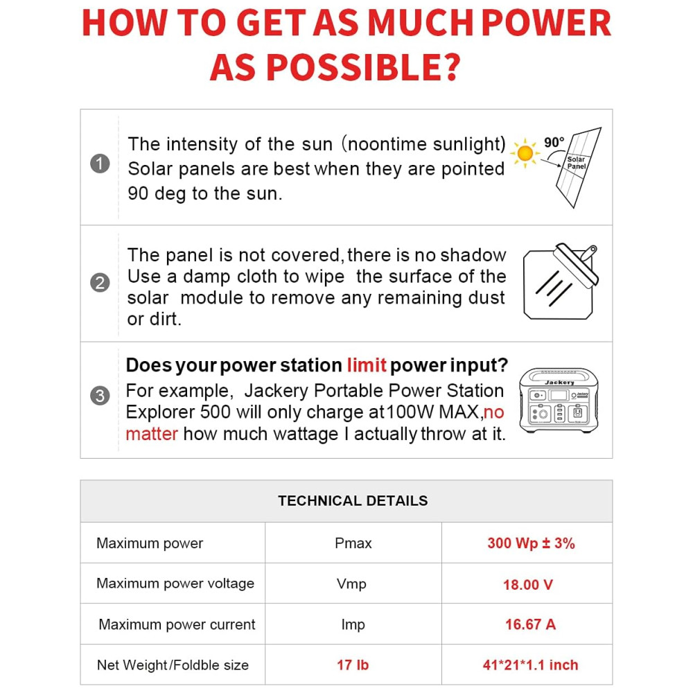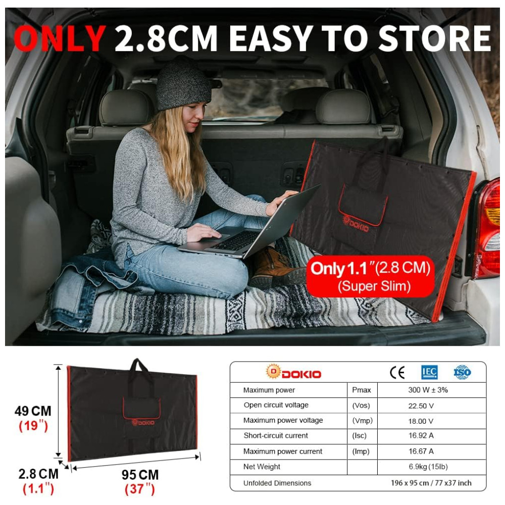 DOBRÁVEL E LEVE E FÁCIL DE CARREGAR Este painel solar fotovoltaico embala 300W de potência, mas tem apenas de espessura, Dimensão dobrável de 104 x e pesa 7 kg, facilitando a montagem, transporte, suspensão e remoção.